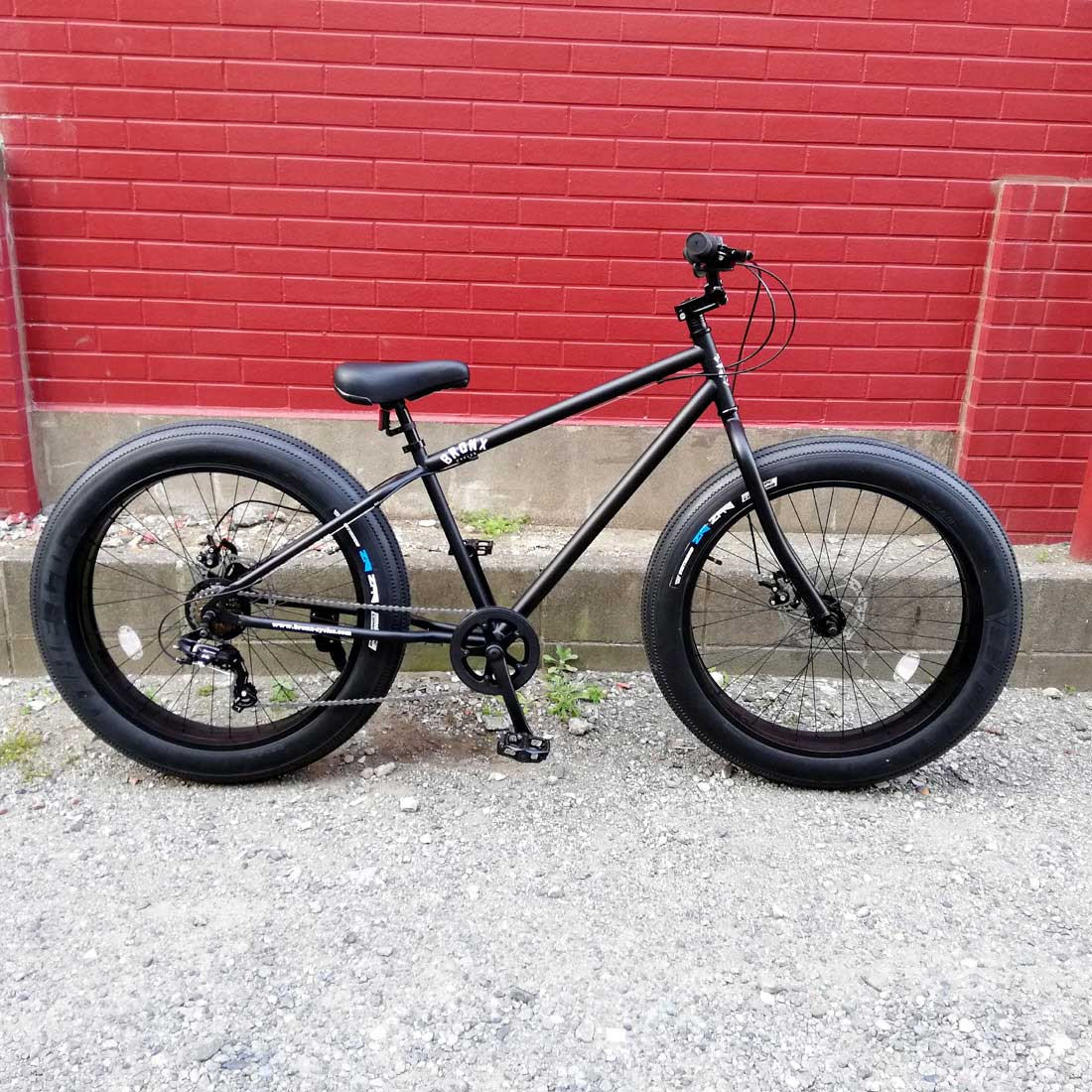 | 今回の一番はこの外装7段変速、これもSHIMANO社製 or Microshift社製のディレーラーを採用していますので確実な変速を約束。 | ファットタイヤの肝、この26×4.0inchのタイヤがあらゆる路面で力を発揮します。 ※画像のタイヤメーカーは変わる事があります。 |