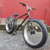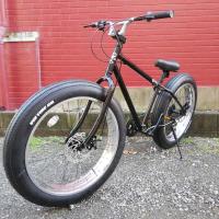 | 今回の一番はこの外装7段変速、これもSHIMANO社製 or Microshift社製ディレーラーを採用していますので確実な変速を約束。 | ファットタイヤの肝、この26×4.0inchのタイヤがあらゆる路面で力を発揮します。 ※画像のタイヤメーカーは変わる事があります。 |
