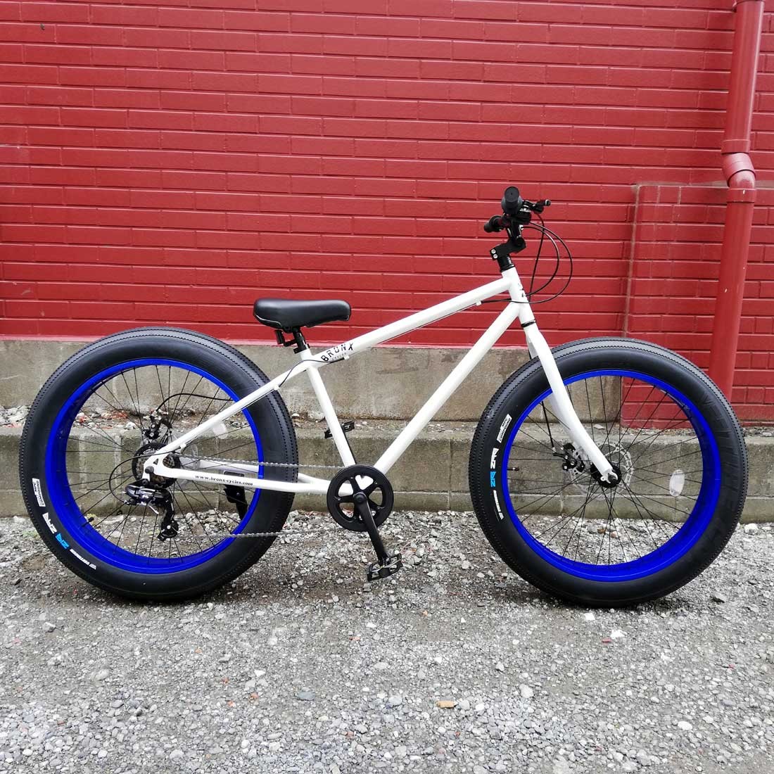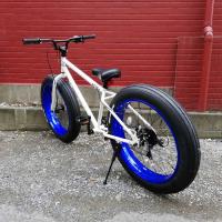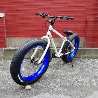 | 今回の一番はこの外装7段変速、これもSHIMANO社製 or Microshift社製のディレーラーを採用していますので確実な変速を約束。 | ファットタイヤの肝、この26×4.0inchのタイヤがあらゆる路面で力を発揮します。 ※画像のタイヤメーカーは変わる事があります。 |