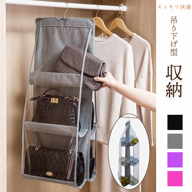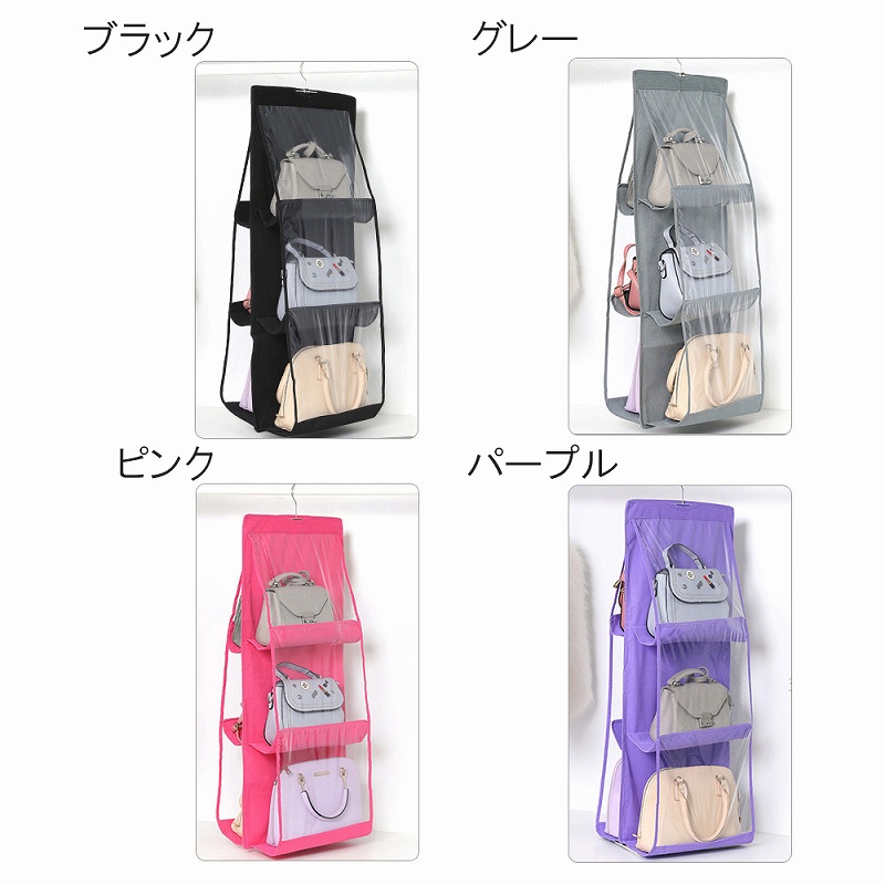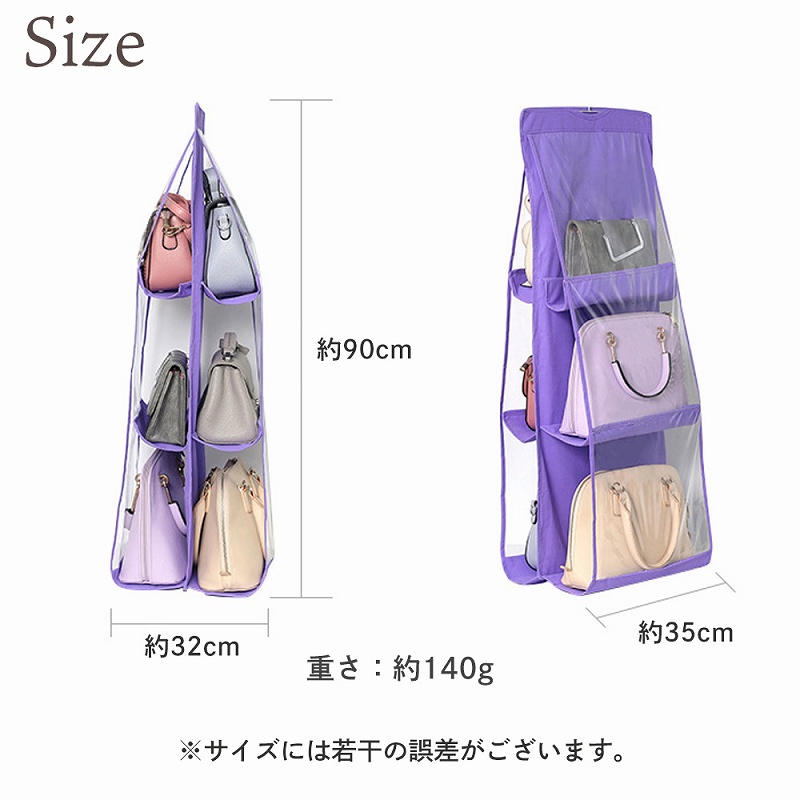 | 横約35cm×高さ約90cm×奥行約32cm 重さ約140g 3段6ポケット 4色展開(ブラック、グレー、ピンク、パープル) |