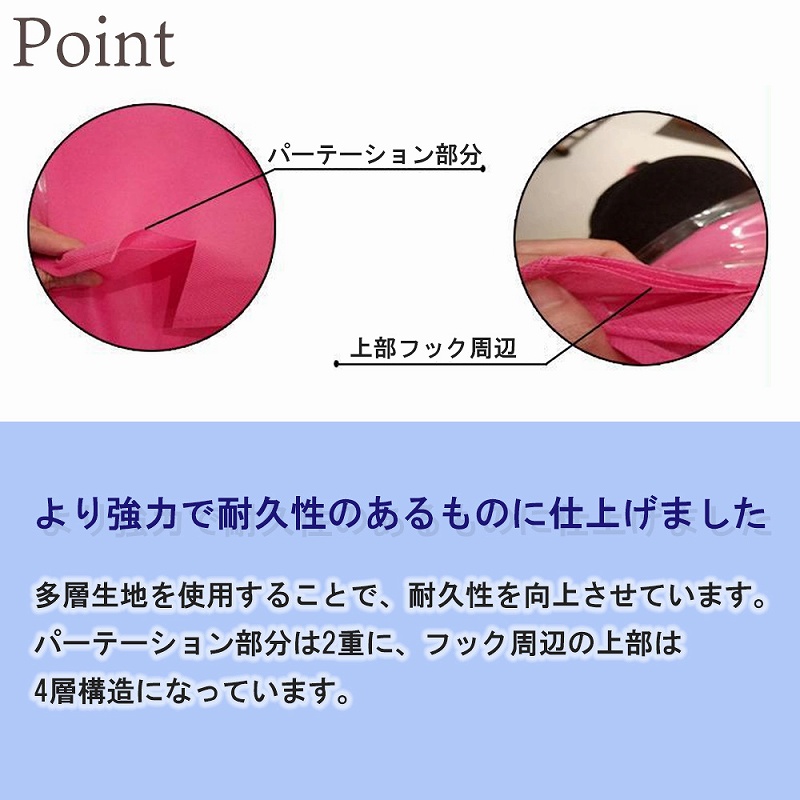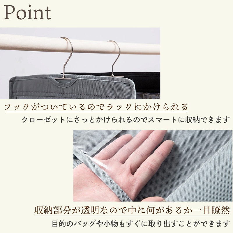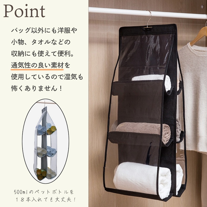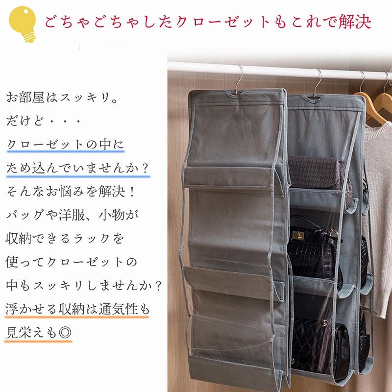 | お部屋はスッキリ。 だけど・・・クローゼットの中にため込んでいませんか? クローゼットをあけて中を見るのが憂鬱。 いつかやらなくちゃとは思いながらも、なかなか進んでいないクローゼットの整理整頓。 この際一気に整理してしまいましょう!バッグや洋服、小物が収納できるラックを使ってクローゼットの中もスッキリしませんか? 浮かせる収納は通気性も見栄えも◎ クローゼットをあけたくなる生活を手に入れましょう。 フックがついているのでササっとハンガーラックにかけることができます。また、収納部分が透明なので何が入っているか一目瞭然です! こちらの商品はバッグ以外にも洋服や小物、タオルなどの収納にも使えて便利。 通気性の良い素材を使用しているので湿気も怖くありません。500mlのペットボトルを18本入れても吊るすことができます。 パーテーション部分や上部には生地を多層にしています。 |