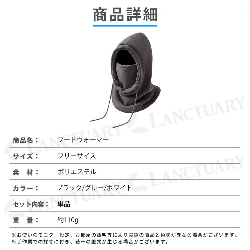 | 商品名:フードウォーマー サイズ:フリーサイズ 素材:ポリエステル カラー:ブラック、グレー、ホワイト 重量:約110g |