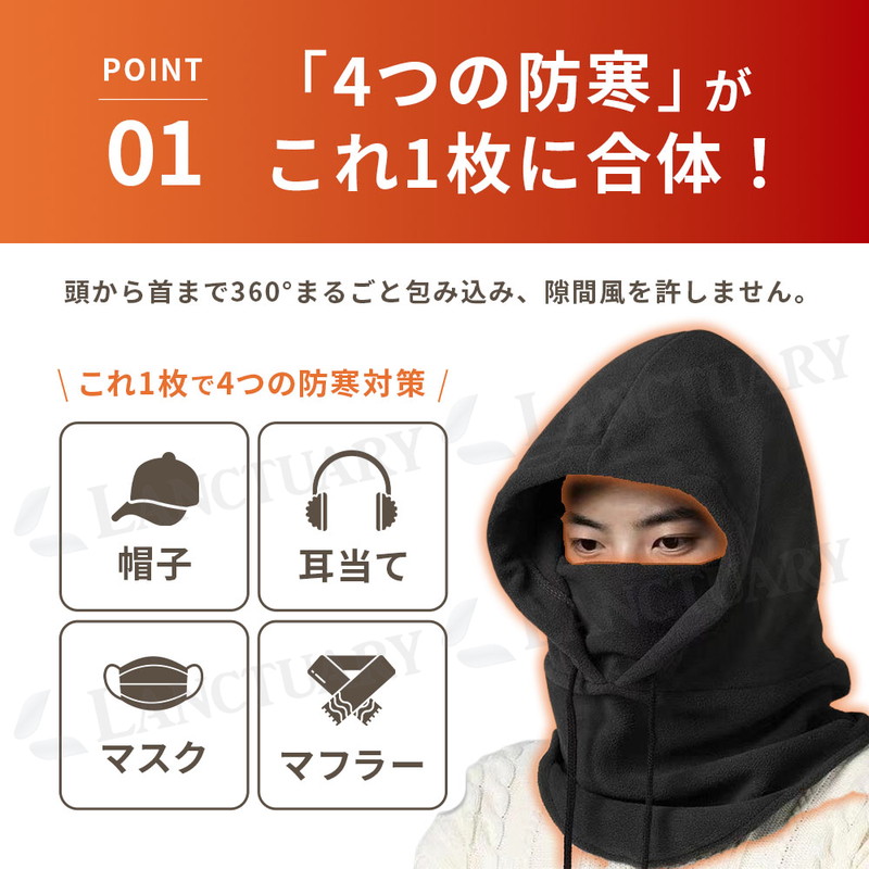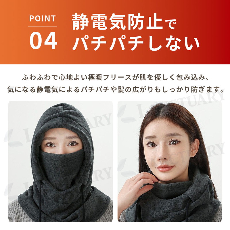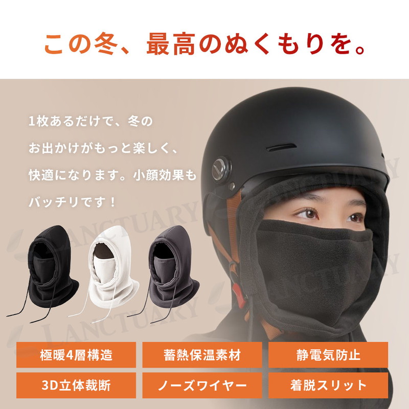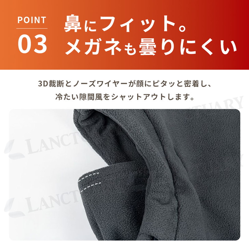 | これ1枚で帽子、マスク、マフラー、耳当ての4役をこなしてくれる便利な防寒アイテムです。 最大の特徴は、独自の4層構造で作られたハイテクな蓄熱素材にあります。 外からの冷たい風をしっかり防ぎながら、中の熱を逃がさない仕組みになっているため、マイナス5度の厳しい寒さの中でも顔周りをポカポカに保ちます。 内側はふわふわとした極厚のフリース素材になっており、肌に触れた時のチクチク感がなく、ずっと触れていたくなるような心地よさです。 顔の形にきれいに沿う3D立体裁断と、鼻の形に合わせて自由に曲げられるノーズワイヤーのおかげで、顔にピタッと密着します。 隙間風が入ってこないのはもちろん、自分の息が上に漏れにくいため、メガネが曇りにくいのも毎日の生活で助かるポイントです。 使い勝手の良さにもこだわっており、後ろ側にガバッと開くスリットを入れました。 これによって、せっかくセットした髪型やメイクを崩すことなく、スムーズに脱ぎ着することができます。 また、冬にありがちな静電気を抑える加工を施しているため、脱ぐ時のパチパチや髪の毛がボサボサに広がる不快感も抑えられます。 左右にある紐を引くだけで、その日の風の強さに合わせてフィット感を自分好みに調節可能です。 とても軽いので長時間つけていても肩がこりにくく、自転車やバイクの通勤、スキー、冬の釣りなど、どんな場面でも大活躍します。 何度洗っても形が崩れにくく、色落ちもしにくい丈夫な作りになっているため、寒い季節の相棒として長く愛用できる一着です。 |