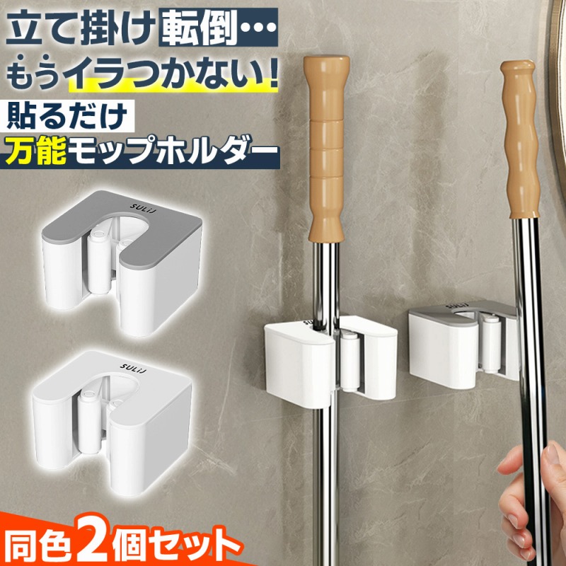 | このモップホルダーは、散らかりがちな掃除道具をきれいに、そして使いやすく片付けるための製品です。壁に穴を開ける面倒な作業は一切いりません。強力な粘着シートで、ペタッと貼るだけでOKです。賃貸のお部屋でも、壁を傷つける心配なく安心してご使用いただけます。ホルダーの内側はシリコン製です。モップやほうきの柄をそっと包み込むようにしっかりホールドします。滑り落ちるのを防ぎつつ、大切な道具に傷をつけない、優しい設計です。 直径8mmから27mmまでの幅広い柄に対応しているので、お手持ちのモップやワイパーはもちろん、傘や野球のバット、釣り竿まで、さまざまなものをサッと収納できます。使い方もとっても簡単。軽く押し込むだけでカチッと固定され、使いたい時は持ち上げるだけでスッと取り出せます。毎日のお掃除が、きっともっとスムーズになります。水に強いABS樹脂でできているから、お風呂場や洗面所など、水気の多い場所でも大丈夫です。浮かせる収納なので、水切れもよくて、いつも清潔に保てます。色は白とグレーをご用意。シンプルだから、どんなお部屋の雰囲気にもすんなり馴染みます。 |