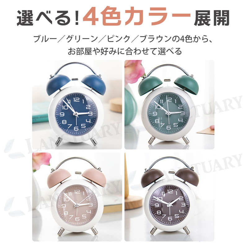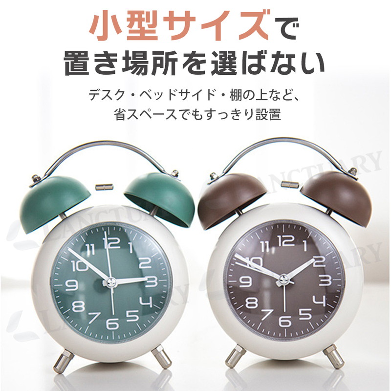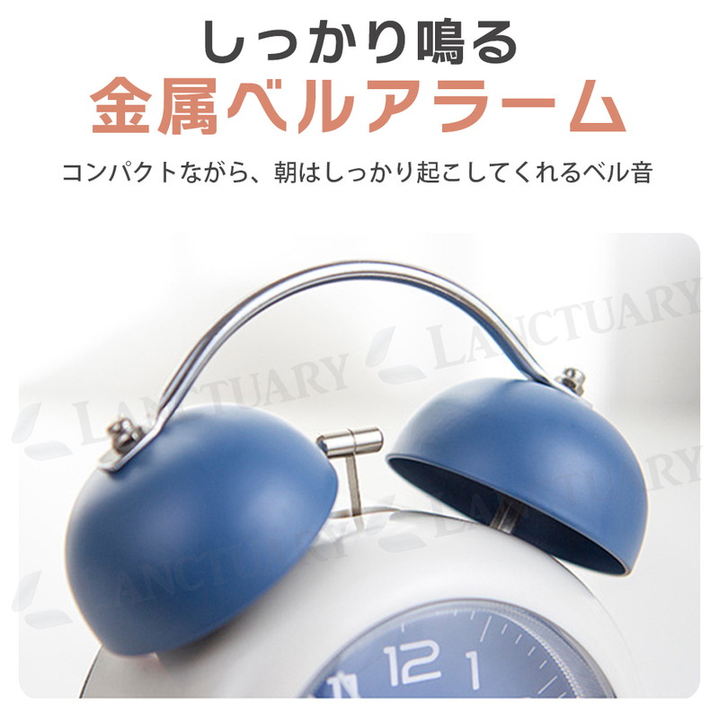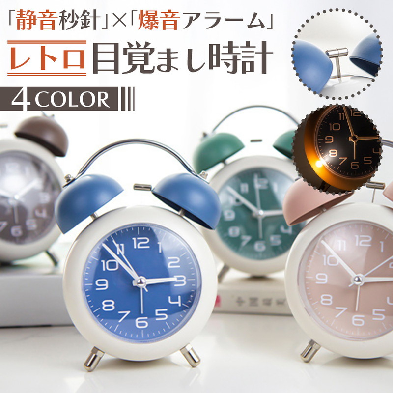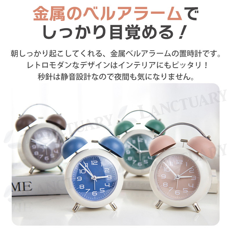 | 朝しっかり起こしてくれる、金属ベルアラームの置時計です。 レトロモダンなデザインは、お部屋のインテリアにもピッタリ。 連続運針の秒針は静音設計なので、夜間も気になりません。 小型サイズで置き場所を取らないので、子供部屋にもすっきり設置。 時間を確認しやすい大きいサイズのアラビア数字、暗い場所では ワンタッチで点灯する夜間ライト付が付いています。 お子様や学生さんへのプレゼントにも喜ばれる目覚まし時計です。 ■静音 秒針の音がほとんど気にならず、就寝中・勉強・在宅ワークでも快適 ■やさしく光る夜間ライト付き ワンタッチで点灯する柔らかな夜灯で、暗い部屋でも時間が確認しやすい ■しっかり鳴る金属ベルアラーム コンパクトながら、朝はしっかり起こしてくれるベル音 ■小型サイズで置き場所を選ばない デスク・ベッドサイド・棚の上など、省スペースでもすっきり設置 ■選べる4色カラー展開 ブルー/グリーン/ブラウン/ピンクの4色から、お部屋や好みに合わせて選べる |