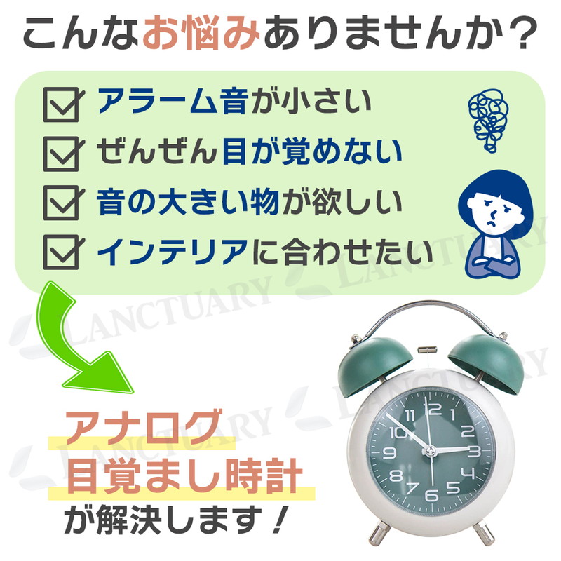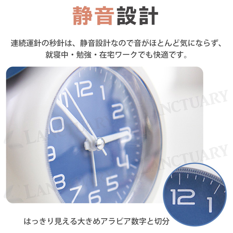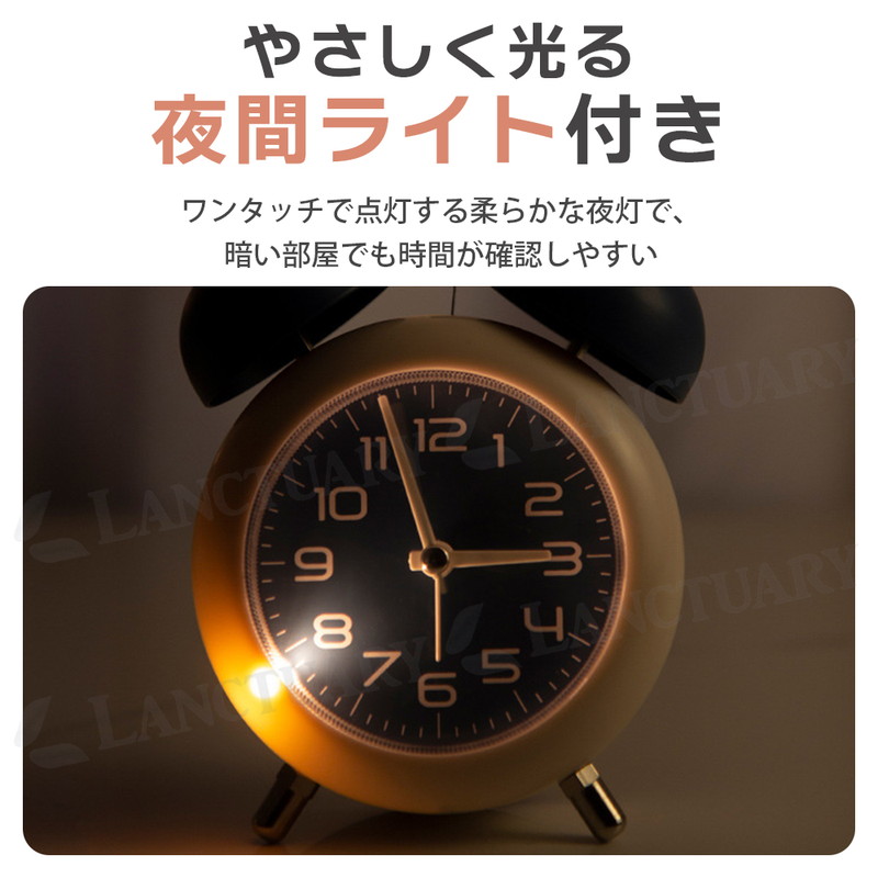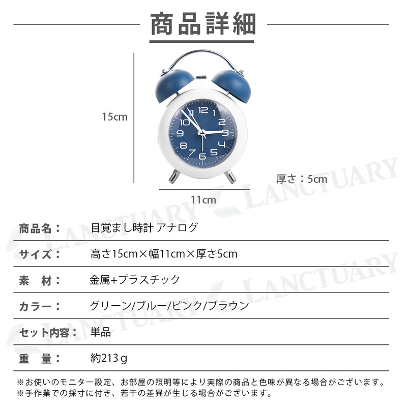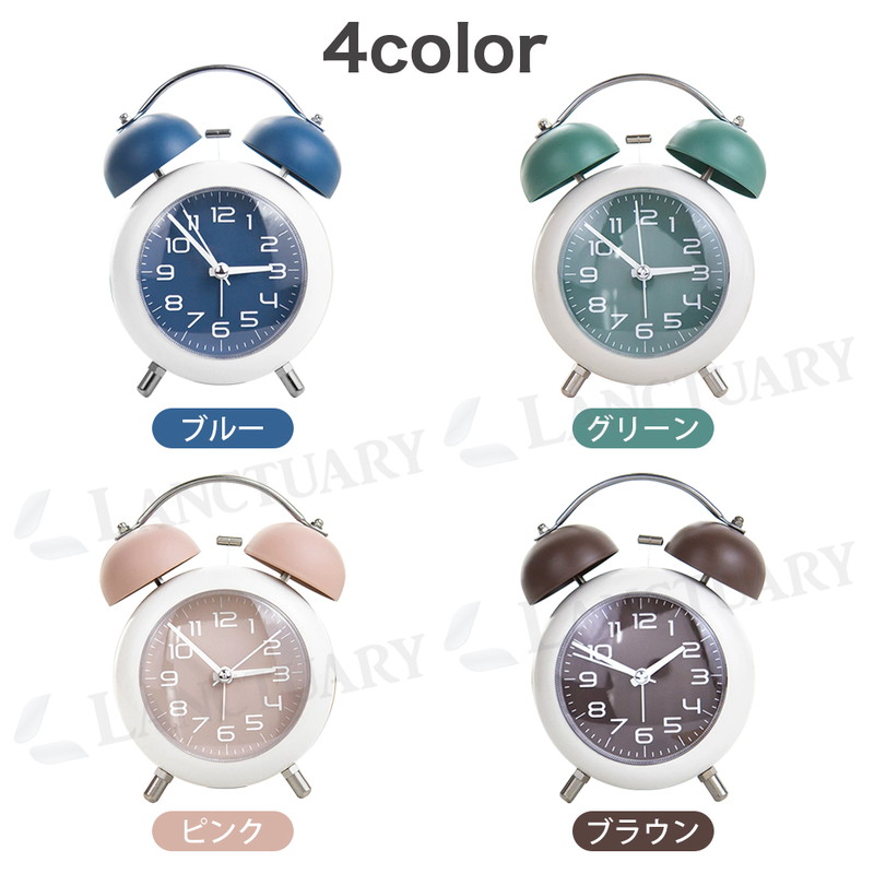 | 朝しっかり起こしてくれる、金属ベルアラームの置時計です。 レトロモダンなデザインは、お部屋のインテリアにもピッタリ。 連続運針の秒針は静音設計なので、夜間も気になりません。 小型サイズで置き場所を取らないので、子供部屋にもすっきり設置。 時間を確認しやすい大きいサイズのアラビア数字、暗い場所では ワンタッチで点灯する夜間ライト付が付いています。 お子様や学生さんへのプレゼントにも喜ばれる目覚まし時計です。 ■静音 秒針の音がほとんど気にならず、就寝中・勉強・在宅ワークでも快適 ■やさしく光る夜間ライト付き ワンタッチで点灯する柔らかな夜灯で、暗い部屋でも時間が確認しやすい ■しっかり鳴る金属ベルアラーム コンパクトながら、朝はしっかり起こしてくれるベル音 ■小型サイズで置き場所を選ばない デスク・ベッドサイド・棚の上など、省スペースでもすっきり設置 ■選べる4色カラー展開 ブルー/グリーン/ブラウン/ピンクの4色から、お部屋や好みに合わせて選べる |