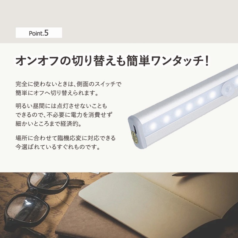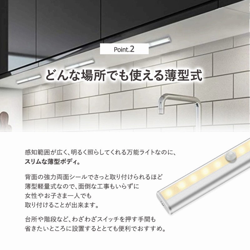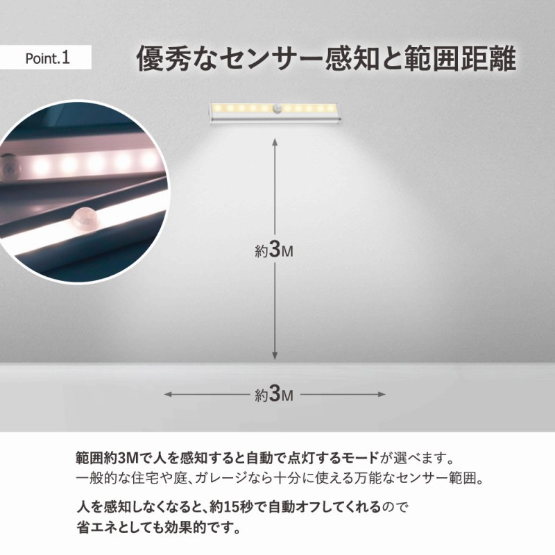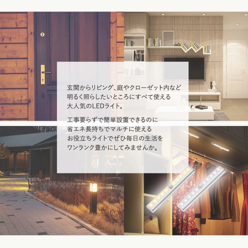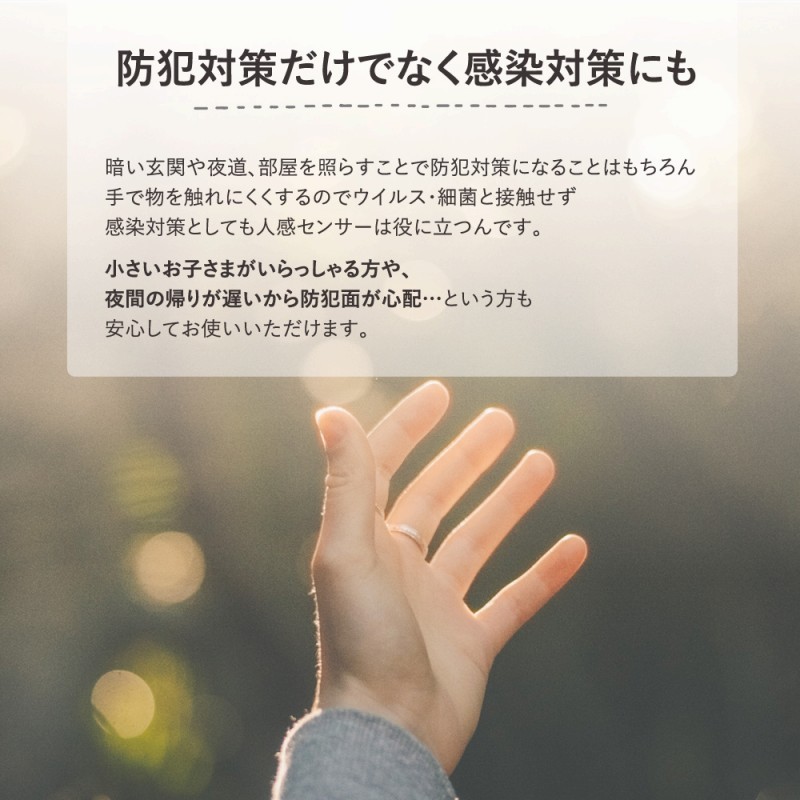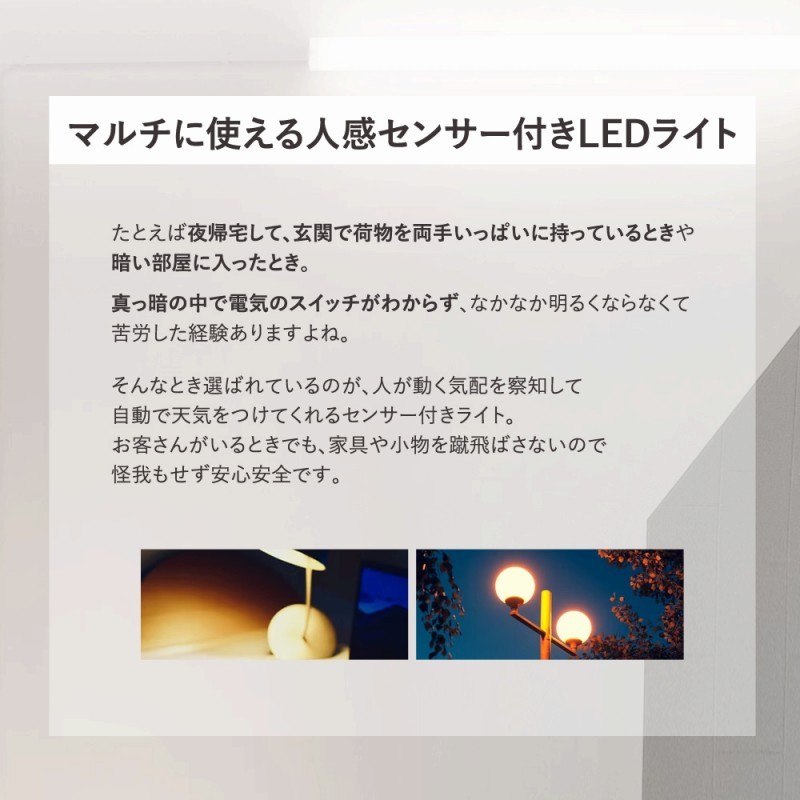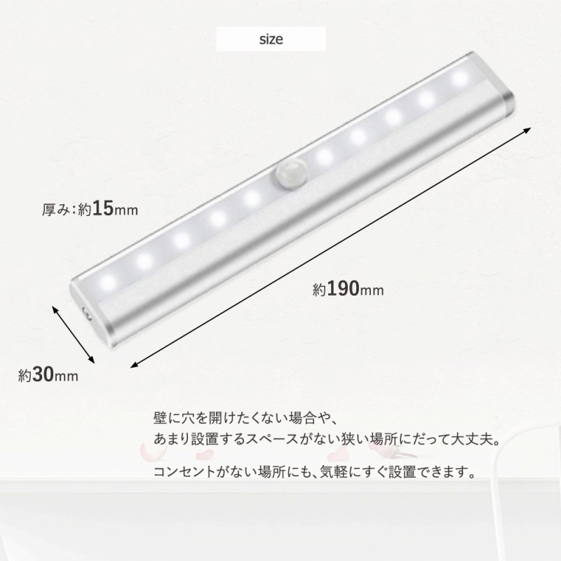| 商品の説明 | 便利なUSB充電式の人感センサーライトです コンセントが届かない場所にも、手軽に取り付けられるので階段や天井にだってすぐ設置できます 背面に両面テープがついてるので、面倒な準備も一切なし あたたかみのある暖色(黄色系)と洗練されたシンプルな白色の2色から選べるので、 シーンや場所、気分に合わせて使い分けることが出来ます 感知範囲が広く、明るく照らしてくれる万能ライトなのに、スリムな薄型ボディ 背面の強力両面シールでさっと取り付けられるほど薄型軽量式なので、 面倒な工事もいらずに女性やお子さま一人でも取り付けることが出来ます 完全に使わないときは、側面のスイッチで簡単にオフへ切り替えられます 明るい昼間には点灯させないこともできるので、不必要に電力を消費せず細かいところまで経済的 人を感知しなくなると、約15秒で自動オフしてくれるので省エネとしても効果的 暗い玄関や夜道、部屋を照らすことで防犯対策に。 手で物を触れにくくするので細菌と接触せず感染対策としても。 |