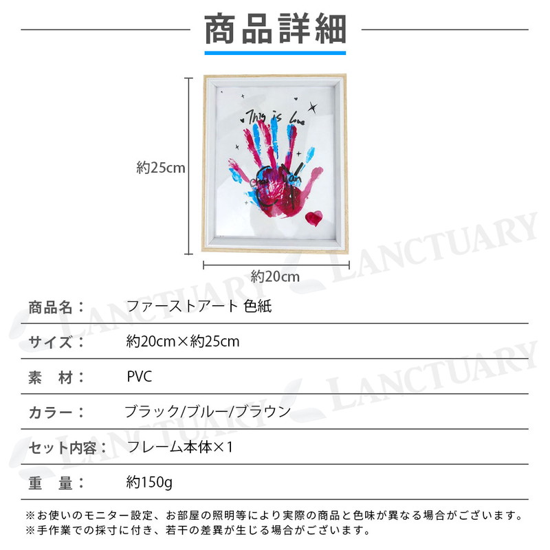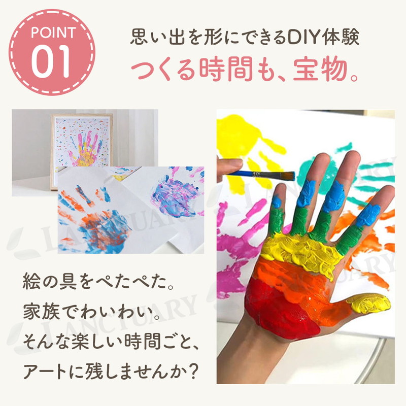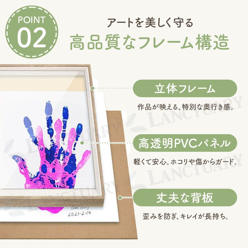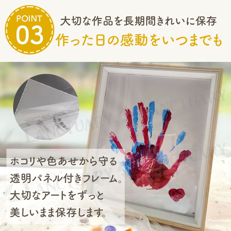 | あっという間に過ぎていく、お子様の成長の瞬間。 そのかけがえのない「今」を、世界にひとつだけのアート作品として残してみませんか。 この手形アート商品は、ご家族で楽しみながら、大切な思い出をかたちにできるアイテムです。 ハーフバースデーや1歳のお誕生日、100日のお祝いなど、お子様の成長の節目に。 また、父の日や母の日、敬老の日の贈り物として、おじちゃんやおばあちゃんへ心のこもったプレゼントを贈るのにも最適です。 家族みんなの手を重ねて、絆を深める記念品を作るのも素敵な時間になるでしょう。 お好きな色の絵の具やスタンプパッドをご用意いただければ、すぐにアート作りを始められます。 画材を手に付け、真っ白な台紙にそっと押す。そのわくわくする体験は、きっとお子様にとっても特別な思い出になります。 自由な発想で、世界にひとつだけの作品を創作する時間をお楽しみください。 完成した作品は、立体フレームに入れて飾ることができます。 作品に奥行きを与えるこのフレームは、お部屋のインテリアをぐっとおしゃれに演出します。 表面にはガラスではなく軽量で割れにくい高透明PVCパネルを使用しているため、万が一の落下時も安心です。 ホコリや傷からも大切なアートを守り、美しい状態を長く保ちます。 シンプルで温かみのあるデザインは、リビングや子ども部屋など、どんな空間にも自然と馴染みます。 壁に飾られたアートを見るたびに、作った日の楽しい記憶がよみがえり、家族の会話が生まれる。 そんな心温まる日常を、この商品がお届けします。 |