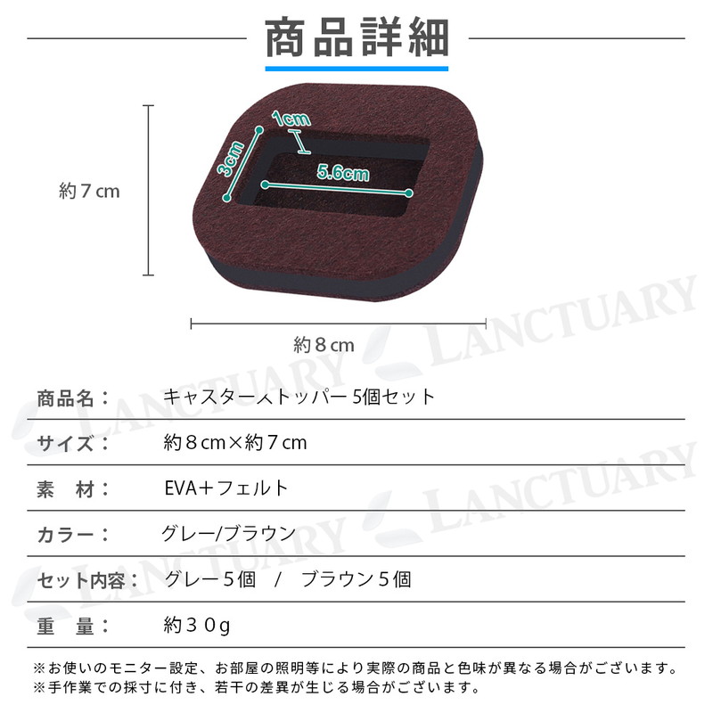 | 商品名 キャスターストッパー 5個セット 種類 グレー、ブラウン セット内容 グレー5個、ブラウン5個 サイズ 8センチ×7センチ 重さ 30グラム 素材 EVA+フェルト |