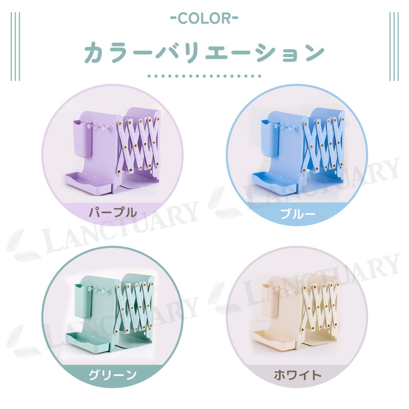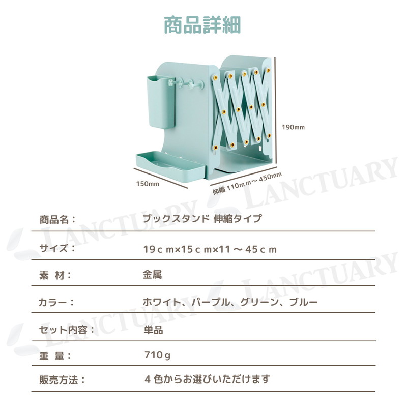 | 商品名:ブックスタンド 伸縮タイプ サイズ:19cm×15cm×11〜45cm 素材:金属 カラー:ホワイト、パープル、グリーン、ブルー セット内容:単品 重量:710g 販売方法:4色からお選びいただけます |