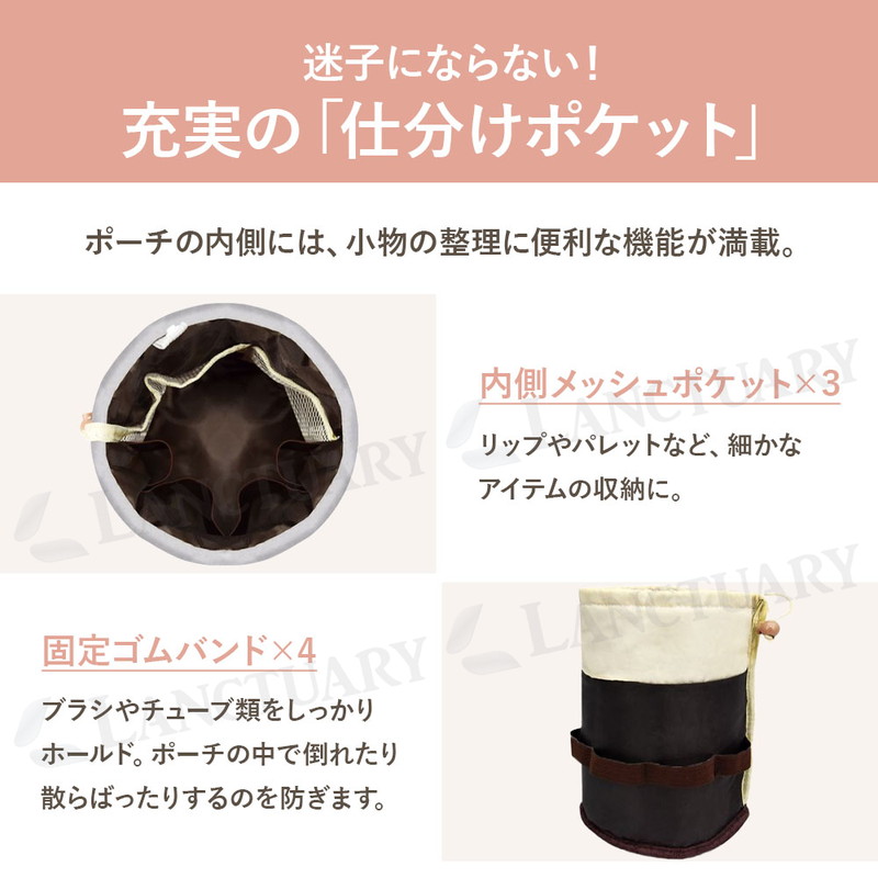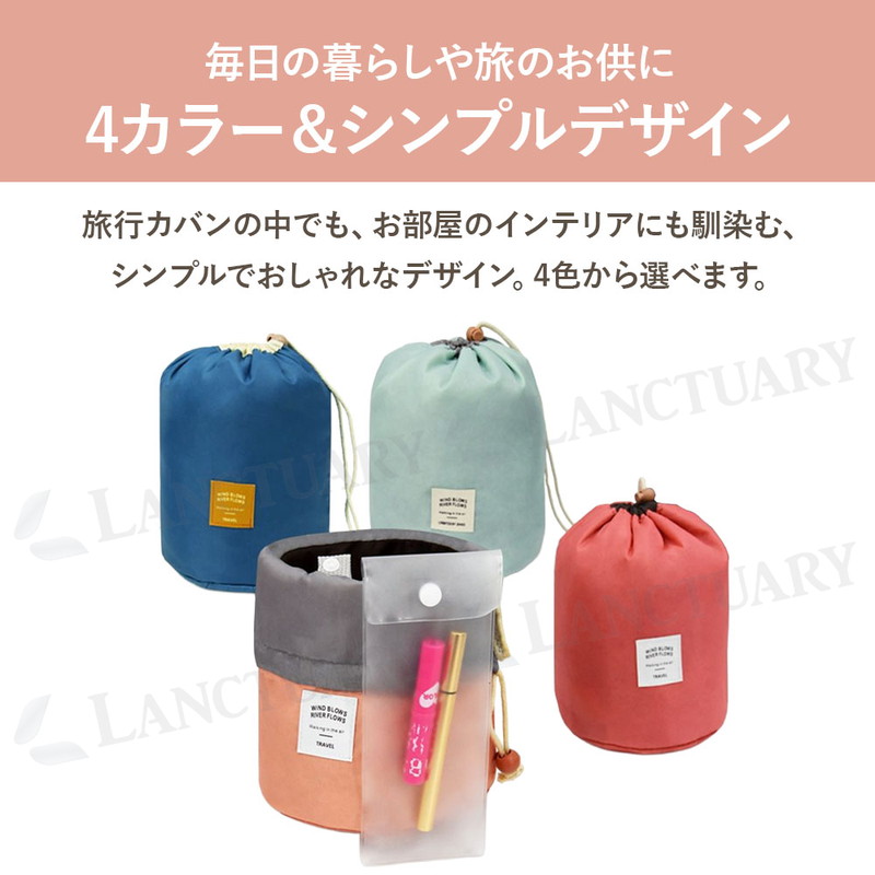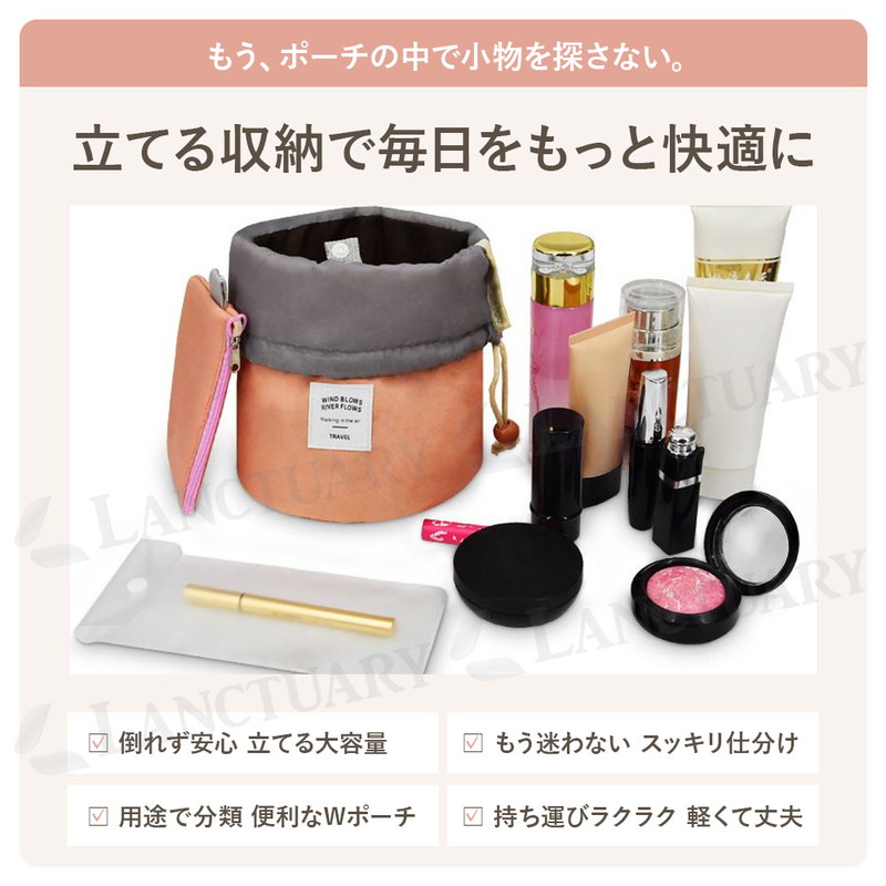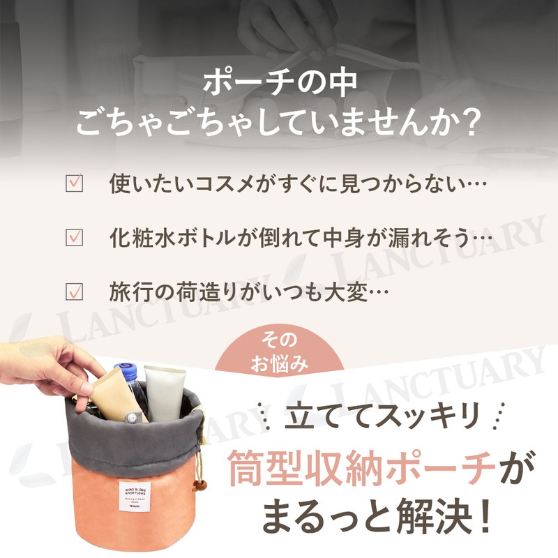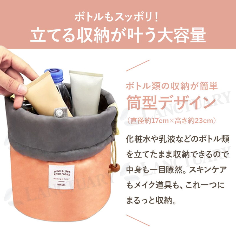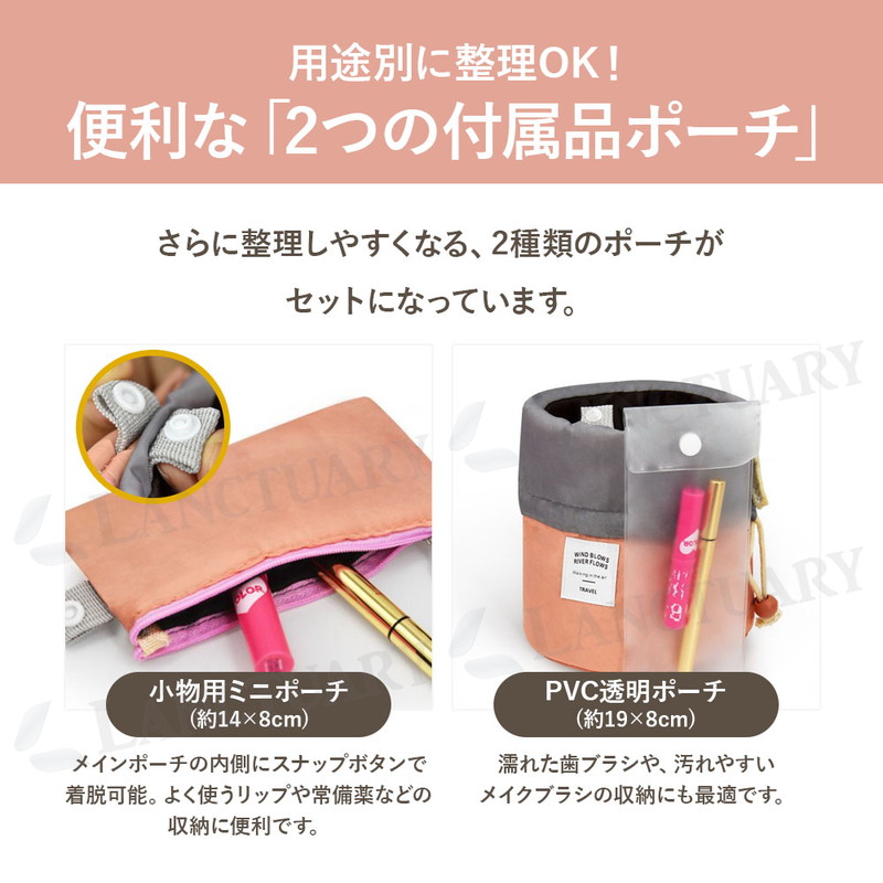 | かさばる化粧品やスキンケア用品を、スッキリまとめて持ち運べる「筒型収納ポーチ」です。 最大の特徴は、十分な深さと直径を備えたサイズ感。 背の高いスキンケアボトルやスプレー缶も、倒さずに「立てたまま」収納できます。中身が一目瞭然になり、使いたいものをサッと取り出せるのが便利なポイントです。 ポーチの内側には、小物の整理に便利な機能も備わっています。 リップやパレットなどの収納に適した3つのメッシュポケット。加えて、4つの固定ゴムバンドが、メイクブラシやチューブ類を所定の位置にしっかりホールド。ポーチの中で中身が散らばるのを防ぎます。 用途に応じて使い分けられる、2種類の付属ポーチも便利です。 リップや常備薬の収納に役立つ小物用ミニポーチは、メインポーチの内側にスナップボタンで着脱できます。 もう一つのPVC透明ポーチは、濡れた歯ブラシやメイクブラシを入れるのに適しており、他のアイテムと分けて収納可能です。 素材は、柔らかく耐久性のあるナイロン生地。 これだけ機能的でありながら、持ち運びに負担のない軽量な仕上がりも魅力です。 開口部は巾着式を採用。口が大きく開くため、中身の確認や出し入れがスムーズに行えます。 旅行、出張、ジム、温泉といったお出かけ時はもちろん、ご自宅のドレッサー周りの整理整頓にも役立ちます。 シンプルなデザインなので、コスメ以外にベビー用品の収納など、幅広くご活用ください。 |