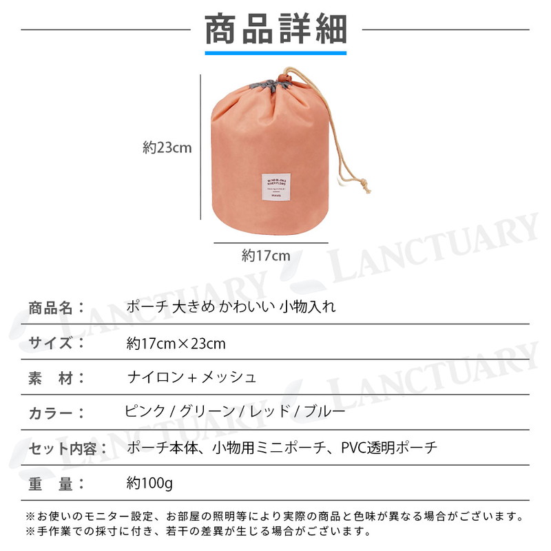 | 商品名:ポーチ 大きめ かわいい 小物入れ セット内容: ポーチ本体、小物用ミニポーチ、PVC透明ポーチ サイズ(約): 本体: 直径17×高さ23cm / ミニポーチ: 14×8cm / PVCポーチ: 19×8cm 重量(約): 100g 素材: ナイロン + メッシュ カラー: ピンク / グリーン / レッド / ブルー |