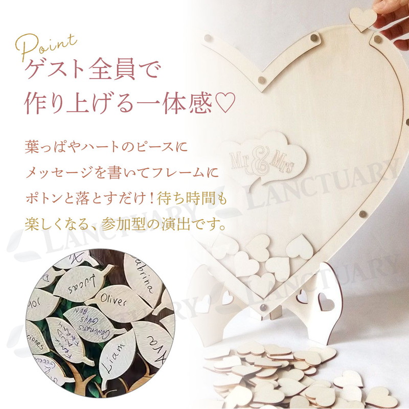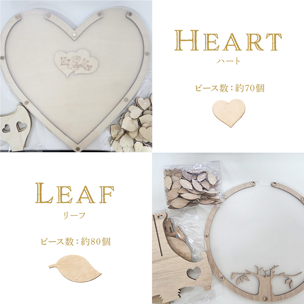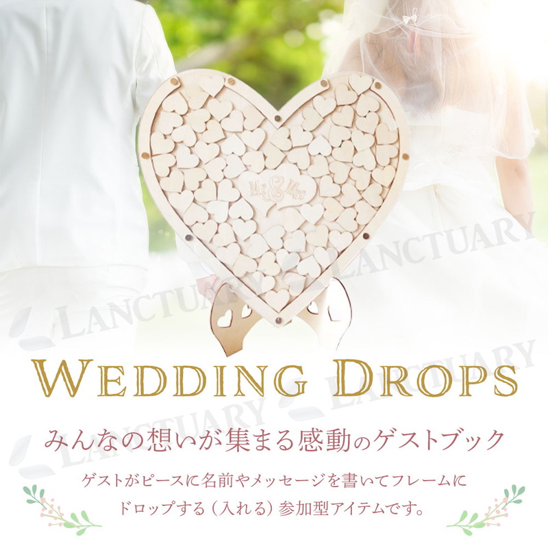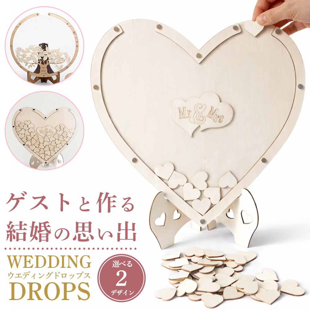 | 大切な結婚式の日をゲストと一緒に作り上げる、参加型のウェディングドロップスです。 従来の芳名帳とは異なり、ゲスト一人ひとりが木のピースに名前やメッセージを書き込んで、フレームへポトンと落としていく演出を楽しめます。 挙式を待つ間の受付時間をワクワクするひとときに変えてくれるだけでなく、新郎新婦とゲストとの絆をより深く感じることができるアイテムです。 デザインは王道で可愛らしいハート型と、ナチュラルな雰囲気のリーフ型の二種類をご用意しました。 どちらも木のぬくもりを活かした自然な質感で、ガーデンウェディングやボタニカルな装飾との相性がとても良いのが特徴です。 透明なパネル越しに積み重なっていくメッセージは、まるでお祝いの気持ちが形になっていくようで、見ているだけで心が温まります。 結婚式が終わった後も、そのままお部屋のインテリアとして飾ることができるため、一生の宝物として大切に手元に残すことができます。 玄関やリビングに置けば、ふとした瞬間にあの日の感動を思い出すことができるでしょう。 |