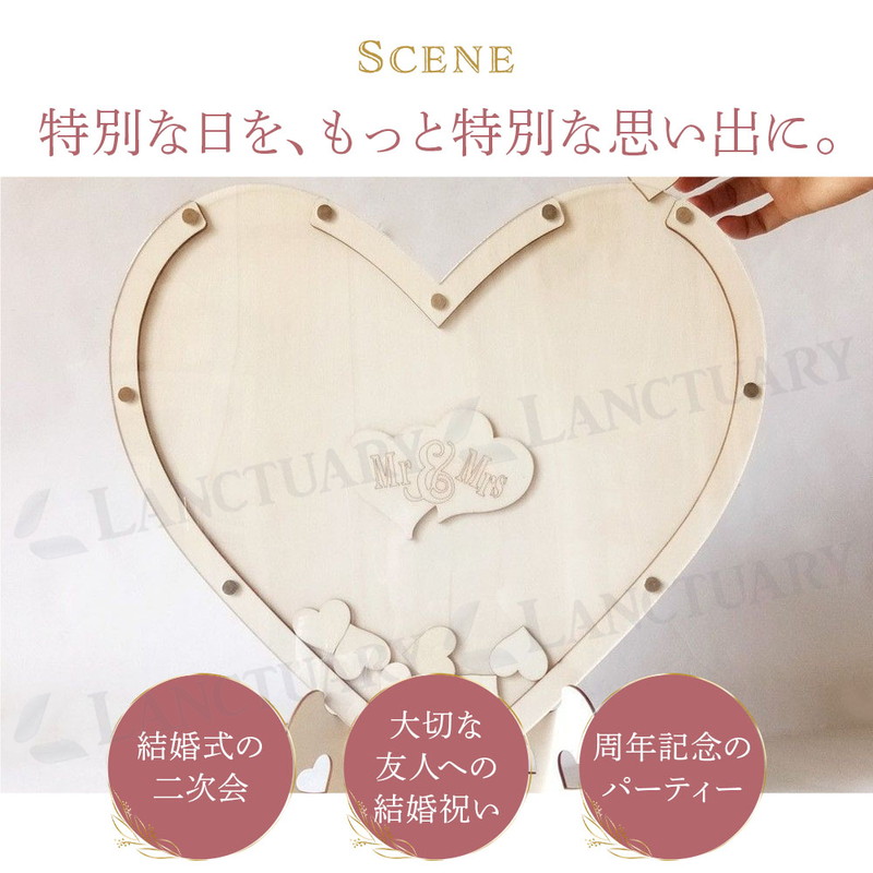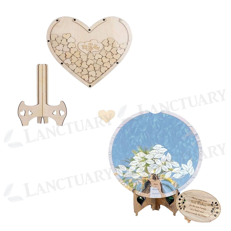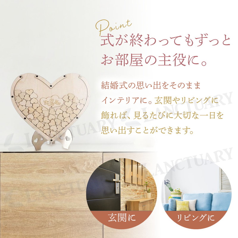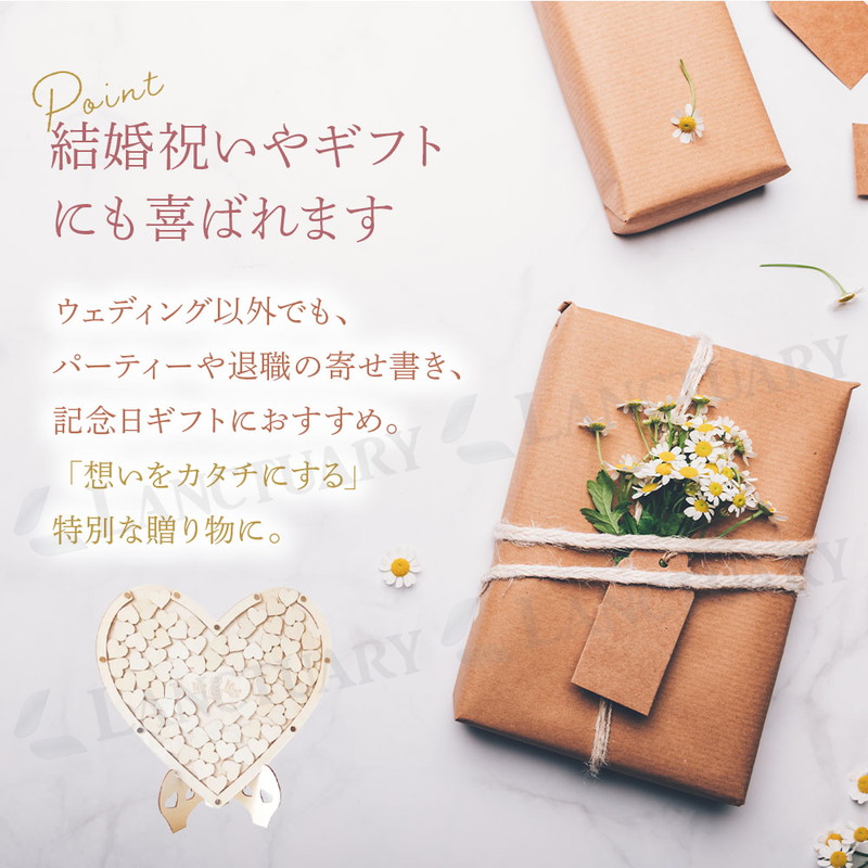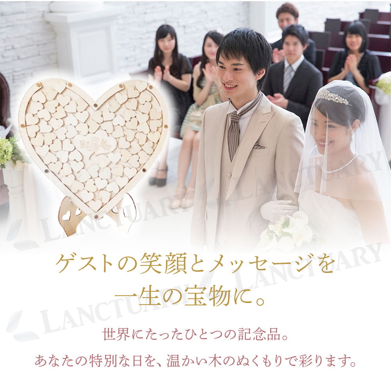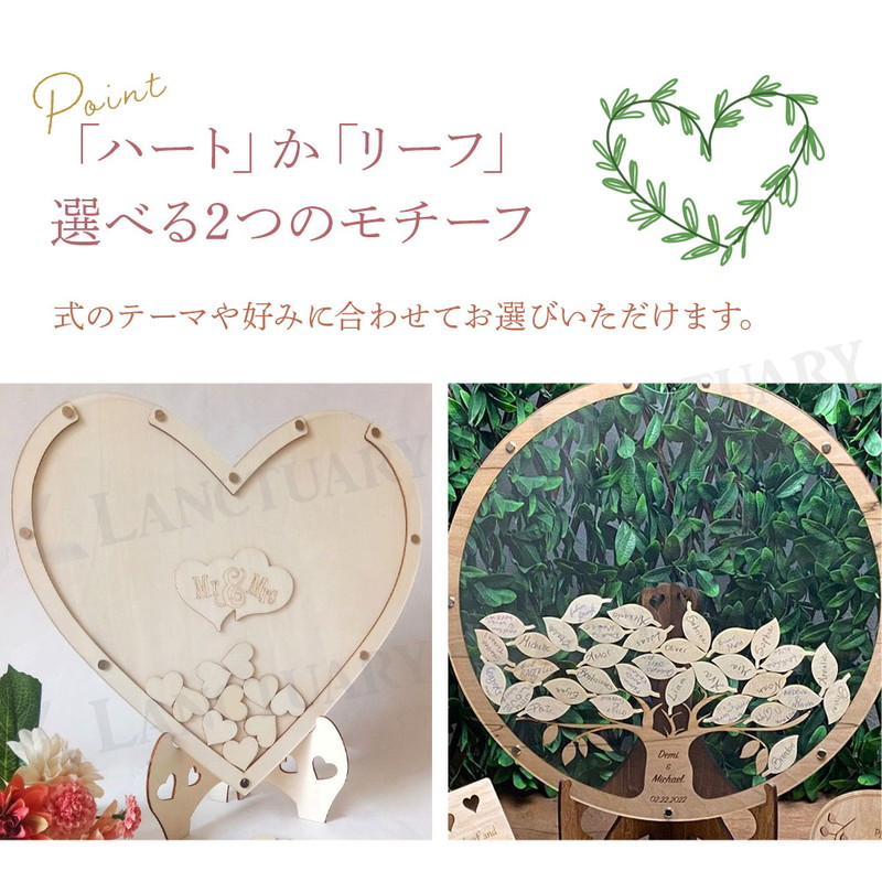 | 大切な結婚式の日をゲストと一緒に作り上げる、参加型のウェディングドロップスです。 従来の芳名帳とは異なり、ゲスト一人ひとりが木のピースに名前やメッセージを書き込んで、フレームへポトンと落としていく演出を楽しめます。 挙式を待つ間の受付時間をワクワクするひとときに変えてくれるだけでなく、新郎新婦とゲストとの絆をより深く感じることができるアイテムです。 デザインは王道で可愛らしいハート型と、ナチュラルな雰囲気のリーフ型の二種類をご用意しました。 どちらも木のぬくもりを活かした自然な質感で、ガーデンウェディングやボタニカルな装飾との相性がとても良いのが特徴です。 透明なパネル越しに積み重なっていくメッセージは、まるでお祝いの気持ちが形になっていくようで、見ているだけで心が温まります。 結婚式が終わった後も、そのままお部屋のインテリアとして飾ることができるため、一生の宝物として大切に手元に残すことができます。 玄関やリビングに置けば、ふとした瞬間にあの日の感動を思い出すことができるでしょう。 |