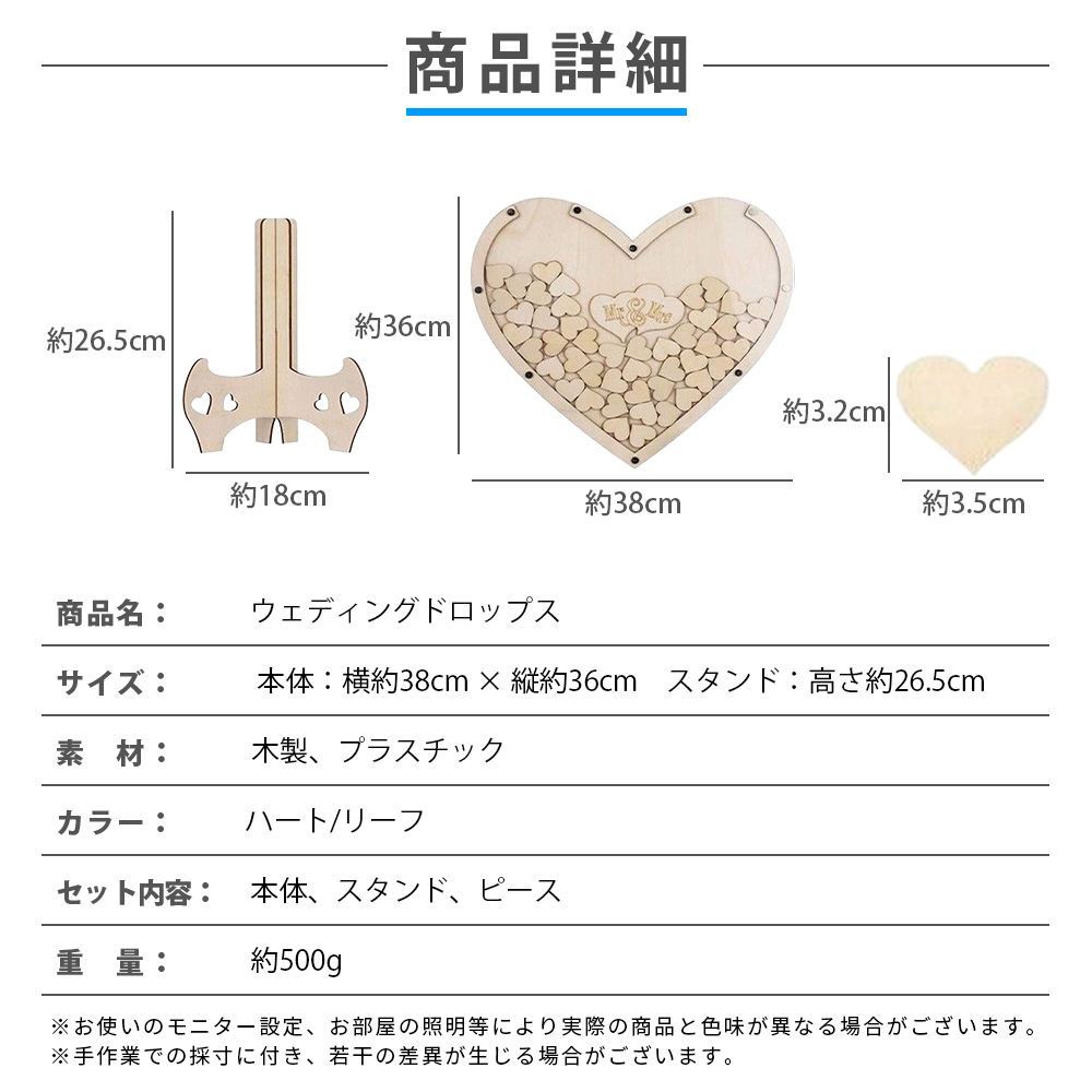 | 商品名: ウェディングドロップス デザイン: ハート / リーフ セット内容: メインフレーム、専用スタンド、メッセージピース 素材:木製/プラスチック サイズ: フレーム:約38cm×36cm / スタンド:高さ約26.5cm ピースサイズ: 約3.5cm×3.2cm 重量: 約500g |
