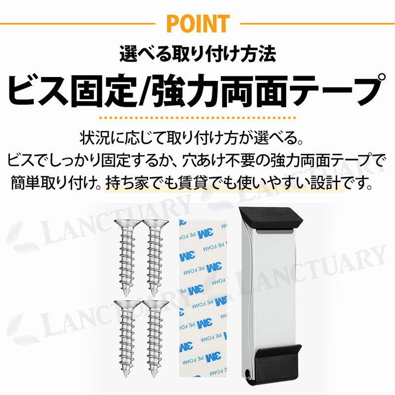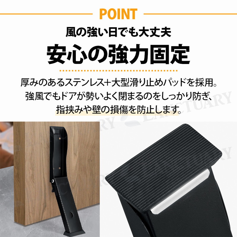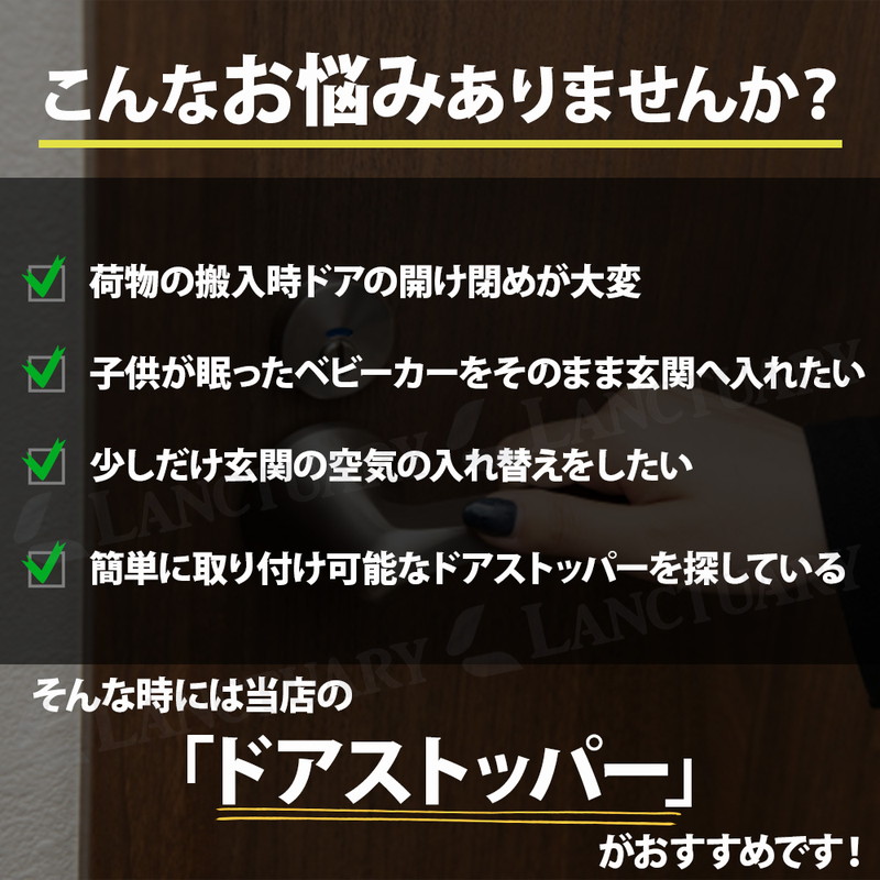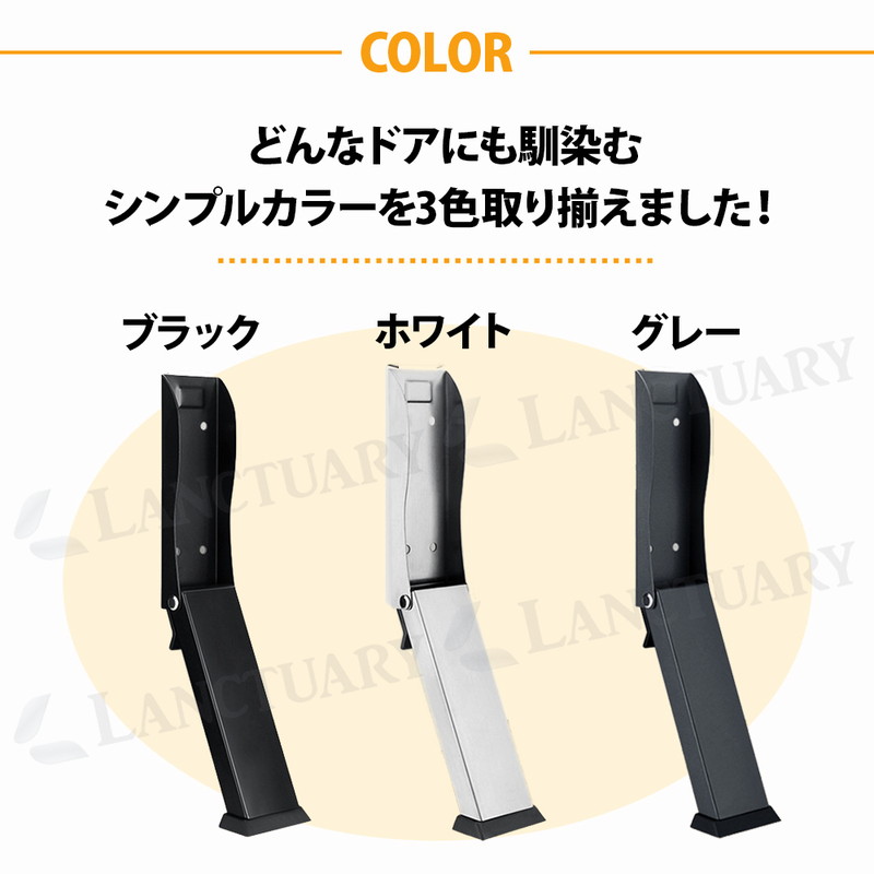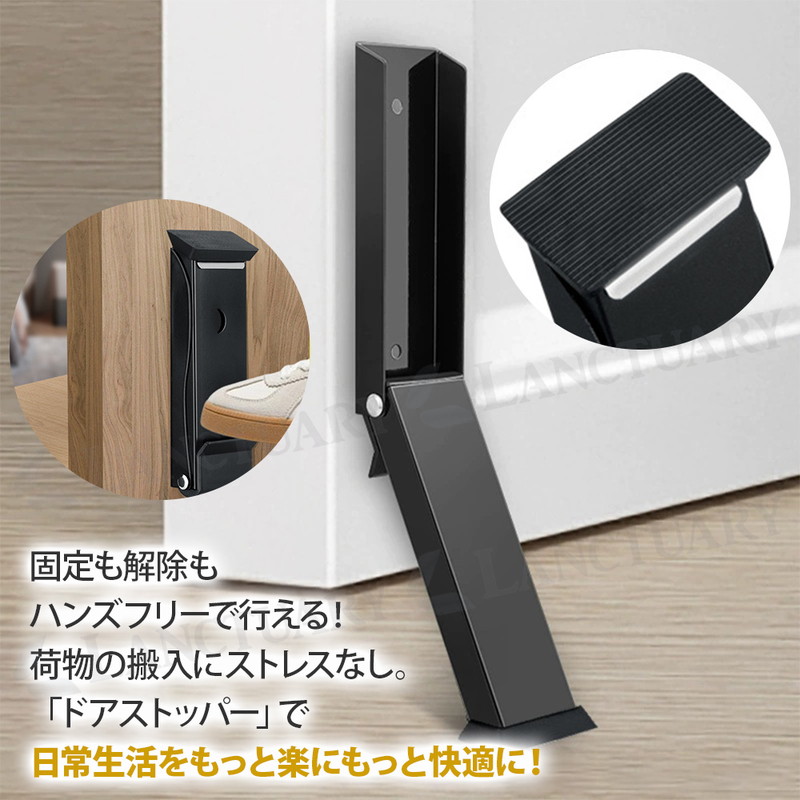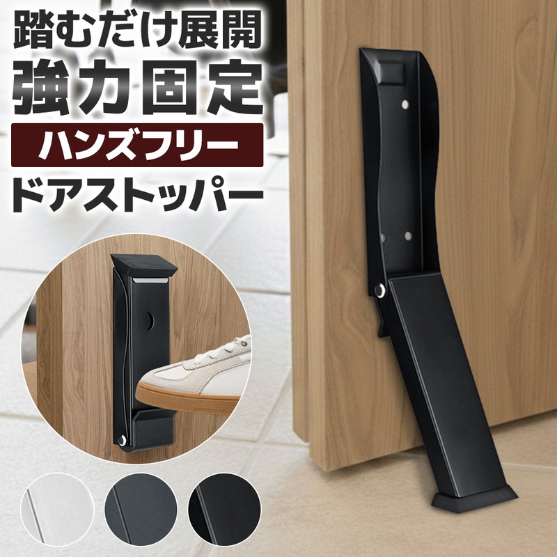 | 荷物の搬入時にとっても便利でストレスなし! 玄関での日常のあれこれをより楽に快適に! あると便利なドアストッパーが登場しました! この商品は厚みのあるステンレスと幅広の滑り止めパッドを採用し安心の固定力を発揮するドアストッパー。 強力固定で強風でもドアが勢いよく閉まるのを防ぎます。 指挟みや壁の損傷をしっかり防止◎ お買い物をたくさんした時やベビーカーの出し入れ時、荷物の受け取り時、手を怪我している時などにとっても便利です。 ロックや解除は足一つででき、かがむことなく下部ペダルを踏むだけ。 両手が塞がっている時などでもハンズフリーで対応でき簡単にドアのロックや解除ができます。 取り付け方法は2つあり、ビス固定と穴あけなしの強力な両面テープです。 賃貸、持ち家、環境に合わせて使用可能です。 底面には幅広のゴムパッドを採用しフローリングやタイルなどを傷つけず、床を保護しながら使用できます。 ストッパーは折りたたみ式で使用しない時は上に軽く押すだけでコンパクトに収納できます。 省スペースに使用できるのも嬉しいポイント! どんなドアにも合うシンプルな3カラーをご用意しました。 ドアストッパー、この機会にお試しください! |
