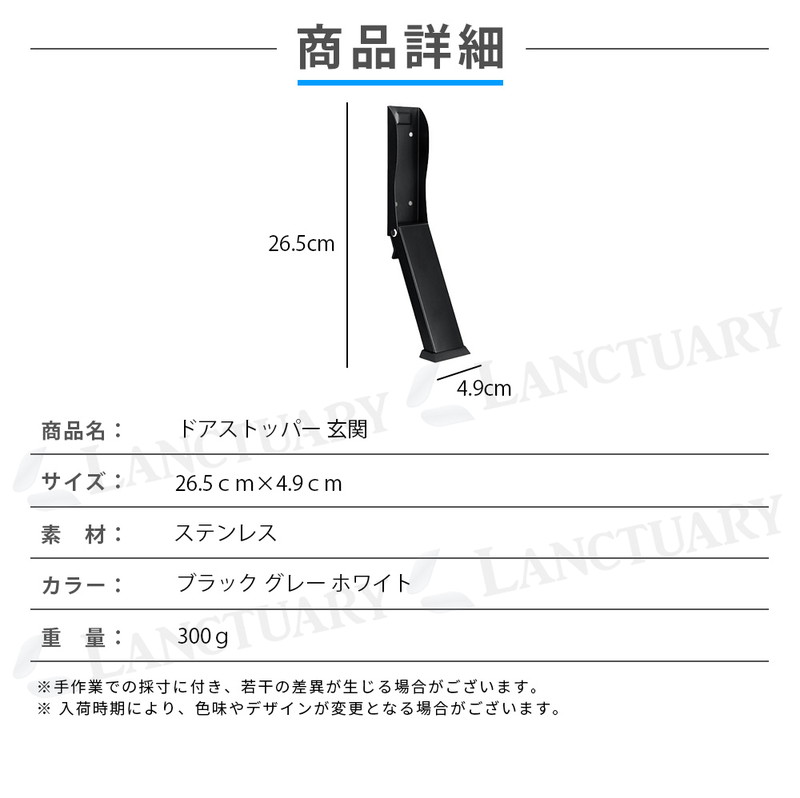 | 商品名:ドアストッパー 扉止め 玄関 素材:ステンレス サイズ:26.5cm×4.9cm 重量:300g カラー:ブラック ホワイト グレー |