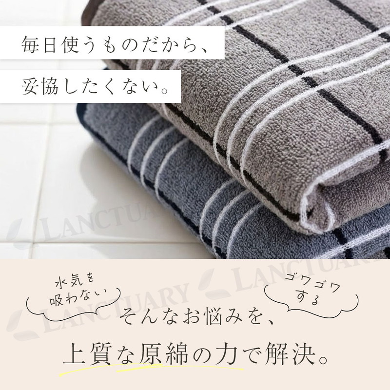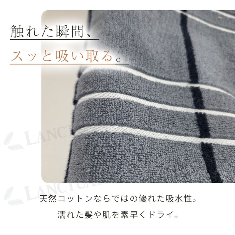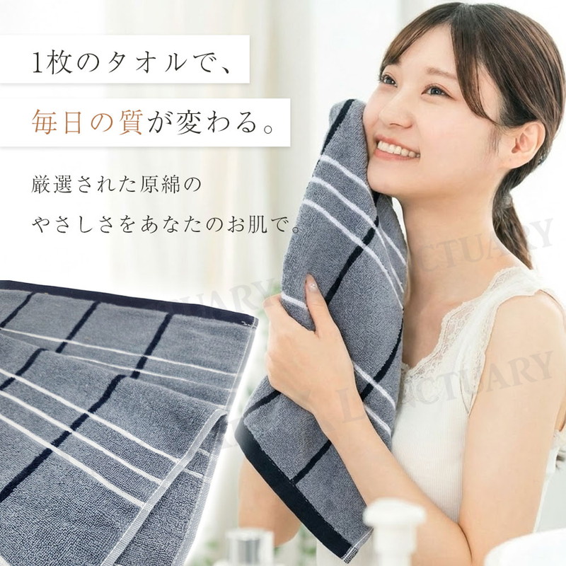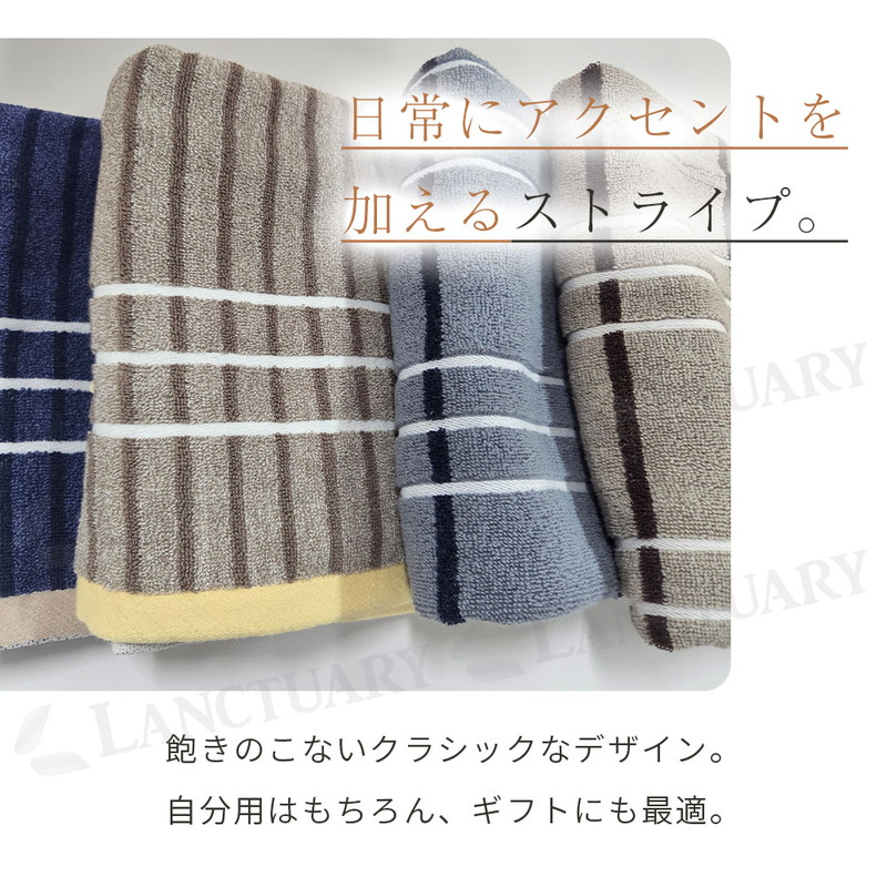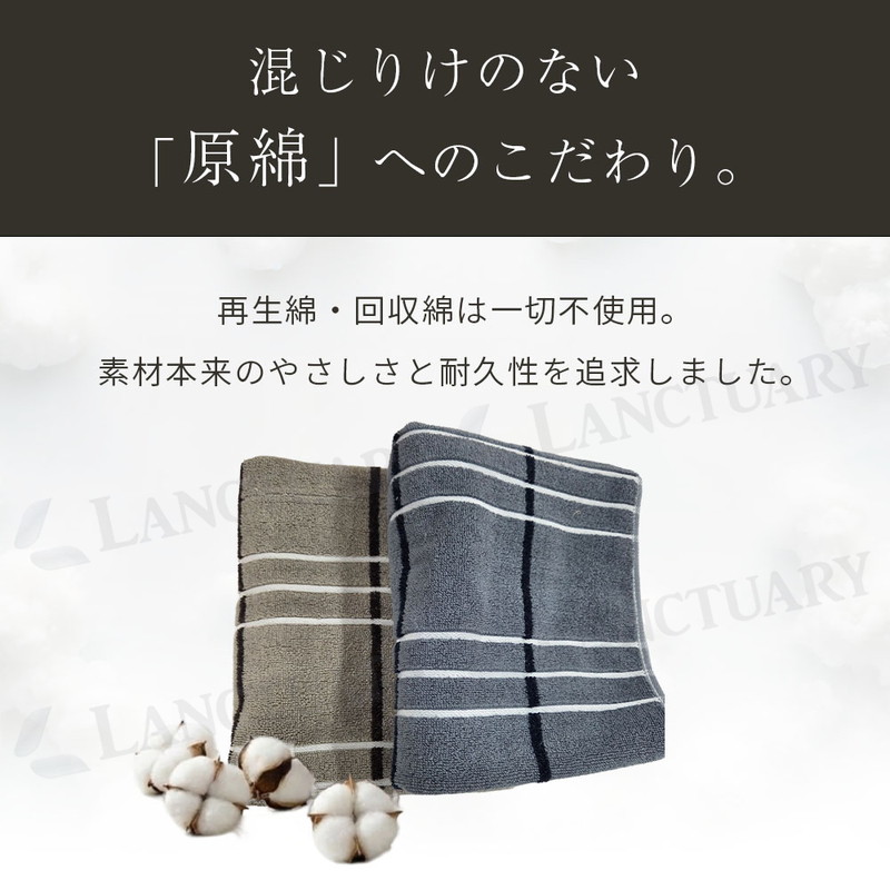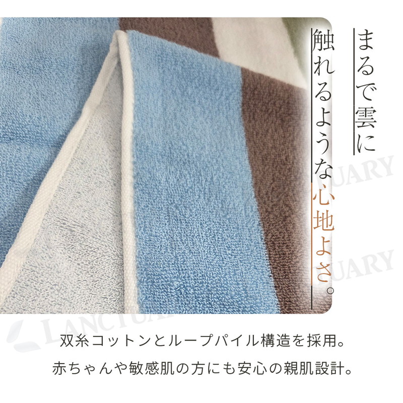 | 毎日お顔や体に触れるものだからこそ、素材の良さにこだわりました。このストライプタオルは、一度使った綿を混ぜたりせず、新しくてきれいな原綿だけを選んで作っています。天然のコットンが持っている自然な柔らかさと、水分をぐんぐん吸い取る力を大切にした一枚です。タオルの表面は、細かなループ状の糸が並ぶ仕組みになっています。このおかげで、雲のようにふわふわした触り心地と、毎日洗ってもへたりにくい丈夫さが生まれました。 お風呂上がりや洗面所でのひとときが、今までよりもっと気持ちよくなります。お肌へのやさしさを一番に考えているので、敏感肌の方や赤ちゃんにも安心してお使いいただけます。 見た目は、ずっと使っても飽きないシンプルなシマ模様のデザインです。洗面所やキッチンに掛けておくだけで、お部屋の雰囲気が明るくおしゃれに変わります。落ち着いた色から明るい色まで、暮らしに合わせやすい7つのカラーを揃えました。色落ちしにくい特別な染め方をしているので、何度お洗濯しても、きれいな色と柔らかい手触りが長く続きます。 通常のタオルよりも少しだけ長い40cm×90cmというサイズは、濡れた髪をまとめたり、スポーツのときに首に掛けたりするのにもぴったりです。 |