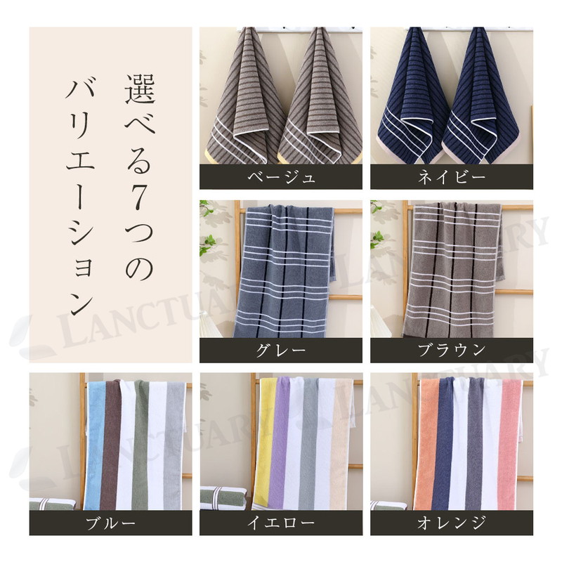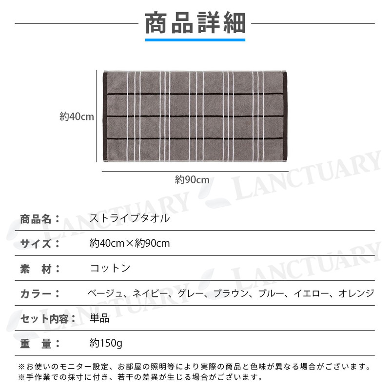 | 商品名:ストライプタオル サイズ:約40×約90cm 素材:コットン(上質原綿100%) カラー:ベージュ、ネイビー、グレー、ブラウン、ブルー、イエロー、オレンジ 重量:約150g セット内容:単品 |