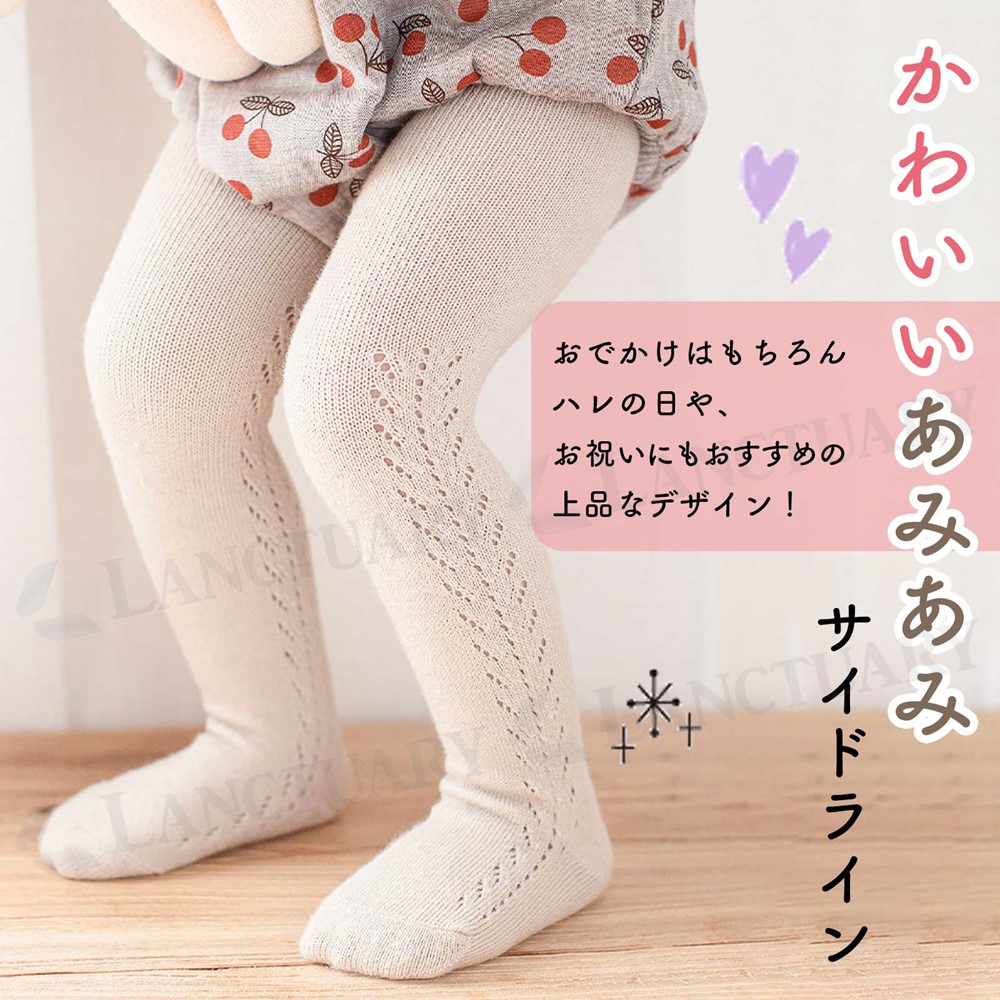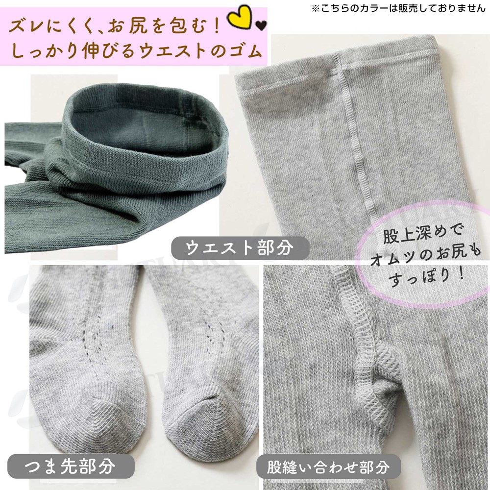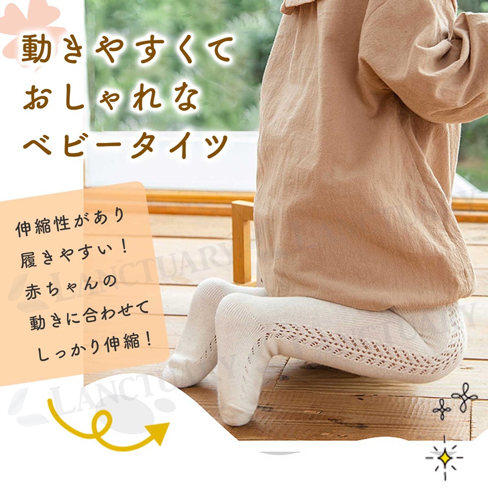 | おしゃれなあみあみサイドのベビータイツです。 シンプルなカラーでおでかけはもちろん、お祝いやフォーマルな場面にもおすすめです。 伸縮性があるのでオムツを履いたお尻もすっぽり包みます。赤ちゃんの活発な動きに合わせて伸びるので苦しくなくフィットします。 通気性もよくムレにくい綿素材と伸縮性、耐久性に優れた素材で快適な履き着心地です! 0歳から5歳ごろまでのサイズと4色のカラーをご用意。様々なコーデにおすすめです。洗い替えでのご用意やご姉弟のおしゃれに、またプレゼントや贈り物にもどうぞ。 |
