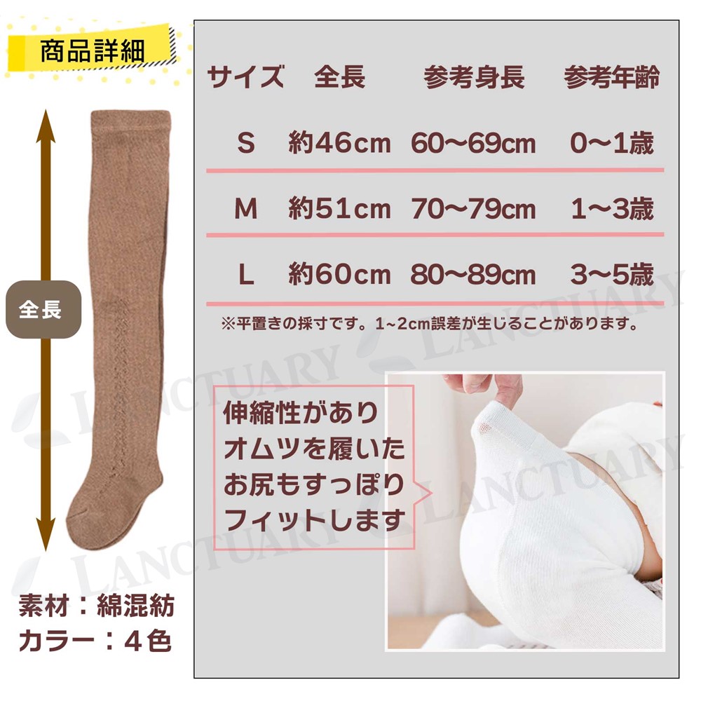 | 【サイズ】 S 0~1歳、M 1~3歳 、L 3~5歳 S:全長約46cm、参考身長60~69cm M:全長約51cm、参考身長70~79cm L:全長約60cm、参考身長80~89cm ※ウエストはゴムで伸縮性があります 【素材】綿混紡 【カラー】モカ・アイボリー・モカベージュ・ピンク |