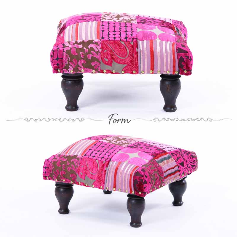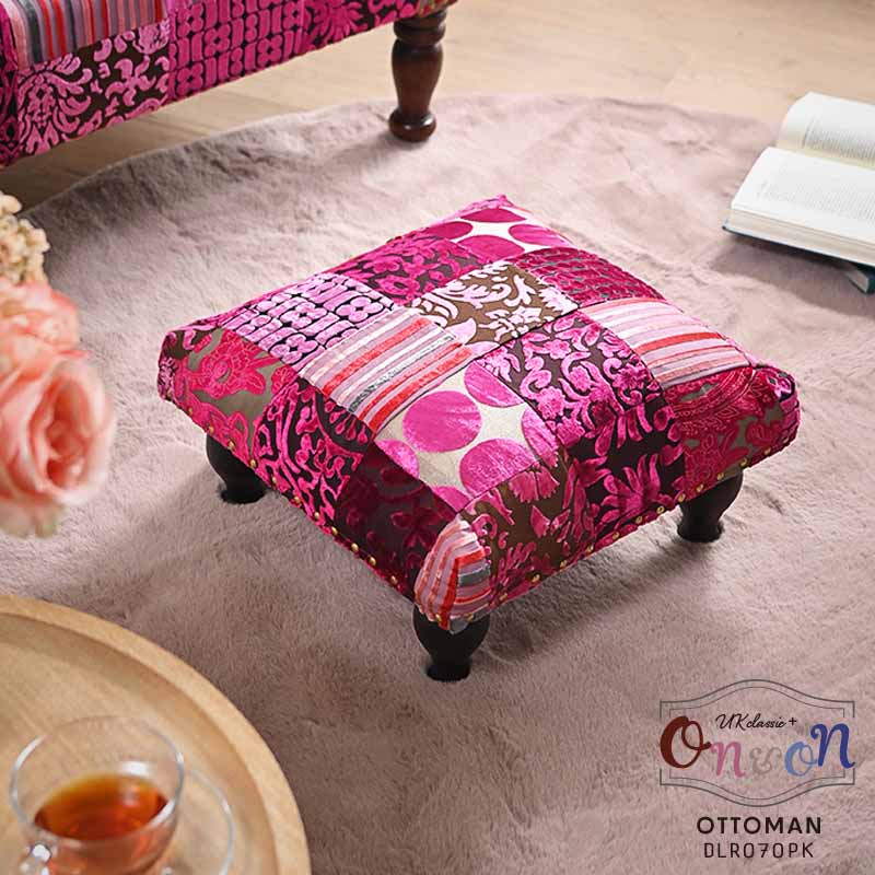 エレガントなアンティーク調のUKクラシックスタイルなフォルムをベースに、遊び心を感じる様々なパターンの生地をパッチワークしたオシャレな足置きオットマン。