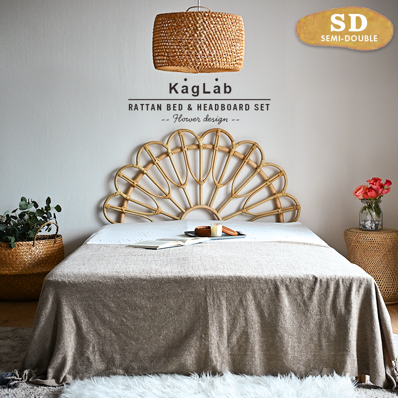 ヘッドボードはしなやかなラタンの曲線を活かしたフラワーデザインで存在感抜群。