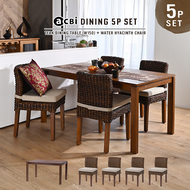 大人4人で座っても十分な広さがある幅150cmテーブルとウォーターヒヤシンスチェア4脚のダイニング5点セット。
