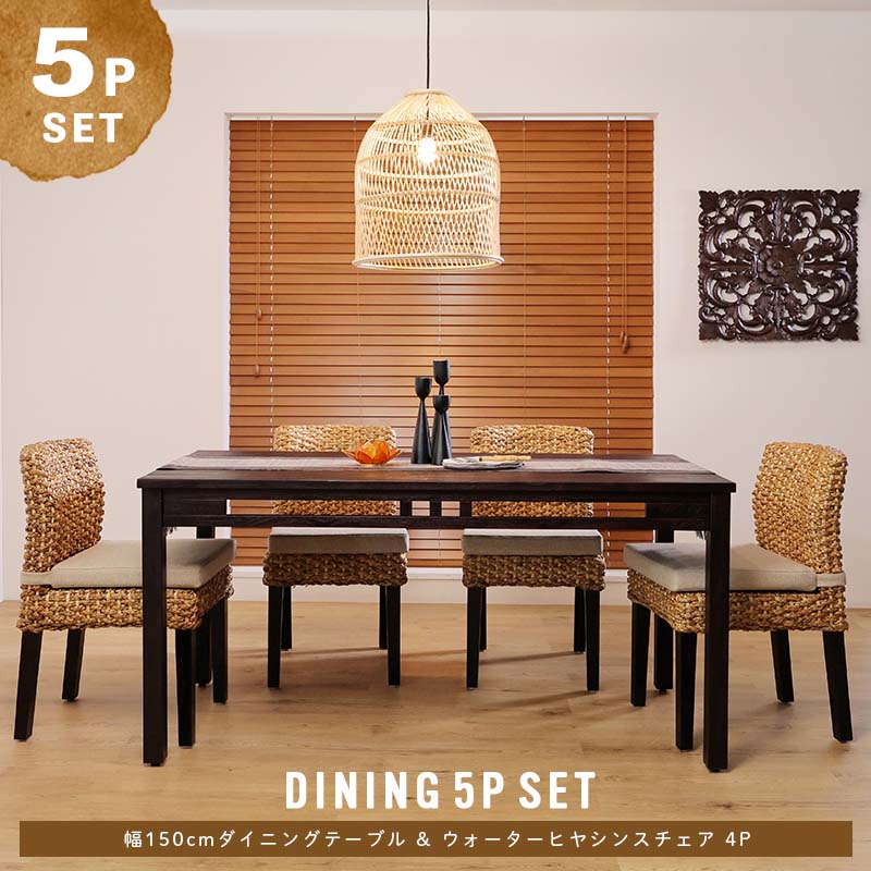 大人4人で座っても十分な広さがある幅150cmテーブルとウォーターヒヤシンスチェア4脚のダイニング5点セット。