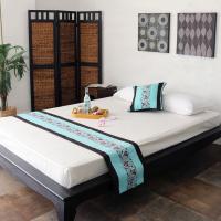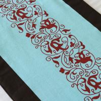 鮮やかなスカイブルーと濃色のトリミング、レッドの唐草文様がワンポイントのベッドランナー。