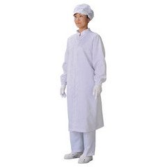 【特長】<br>●簡易のクリーンワークや来客用に最適です。<br>●比翼仕立てにより襟元からの発塵を防ぎます。<br><br>【用途】<br>●クリーンルーム用。<br><br>【使用】<br>●色:ホワイト<br>●サイズ:M<br>●着丈(cm):110<br>●適応胸囲(cm):86〜94<br>●色:ホワイト<br><br>【材質/仕上】<br>●ポリエステル<br><br>【セット内容/付属品】<br>●クリーンパックではありません。<br>●帽子・手袋・パンツ・サンダルは別売です。<br><br>【注意】<br>●クリーンパックではありません。<br>●帽子・手袋・