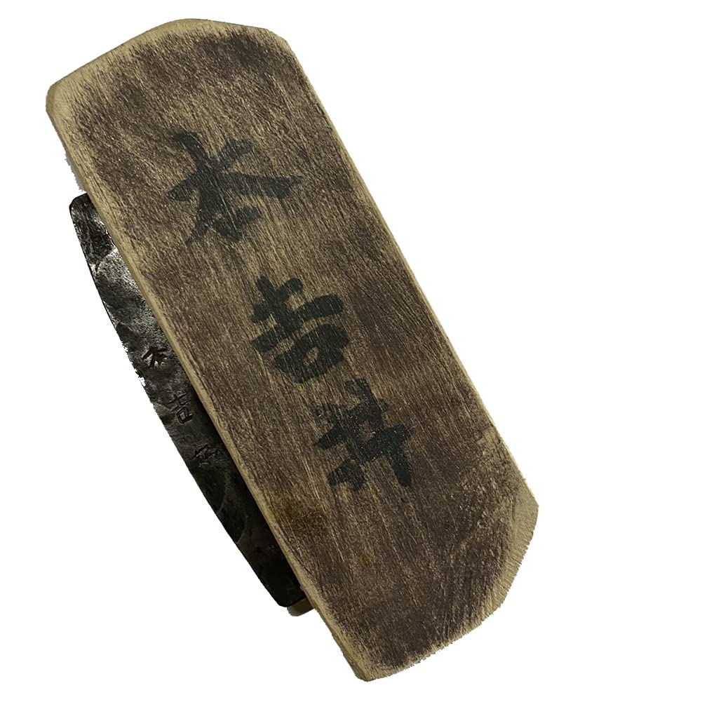 江戸期のカスガイ型火打鎌は、焼印の他に必ず金の部分に鏨(タガネ) による銘が打たれていた。銘が打たれていないものは明治になってからと 考えられる。柄の部分は焼印だけでは文字が黒く残らないので、墨を入れ ていた可能性が多い。或いは火打箱の消し炭が焼印部分に自然と入り込ん だかも知れない