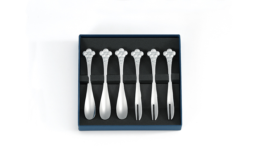 鶴田一郎のオリジナルデザイン。梅の花をモチーフにした、和菓子にピッタリなカトラリーセット。フォークの先は和菓子用のフォークに近い形状で、旬のフルーツをいただくときのピックフォークとしてもお使いいただけます。