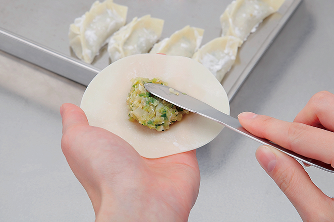 すくう部分が平らなので餡が残らずに餃子が作りやすい!必要な餡の量が確認しやすい目安ライン付。