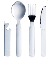 スプーン、フォーク、ナイフ、栓抜、缶切のカトラリーセット。ステンレス製なのでお手入れしやすい。使わない時はコンパクトになるのでアウトドアでの持ち運びでも嵩張りません。