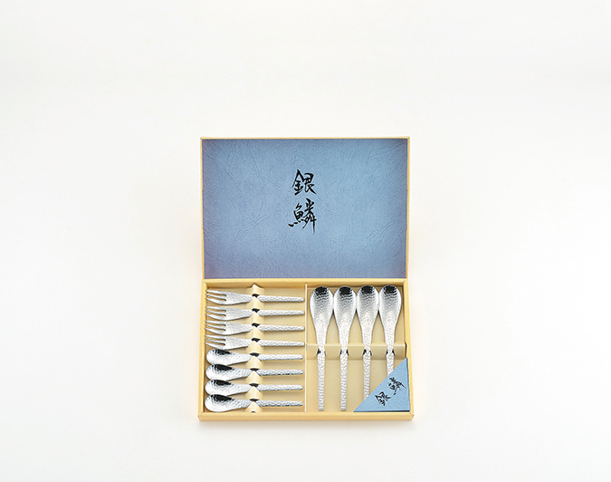 流線形のフォルムに鱗の輝きをイメージしたデザインです。槌目模様に光が美しく反射し、和食器にも合いますので普段使いやおもてなしにもお使いいただけます。4人で使えるセットになっており、スプーンとフォーク、お食事などに使いやすいデザートスプーンの組み合わせです。揃いのデザインがあると急なおもてなしの場面でも安心。食洗機対応でお手入れ簡単なステンレス製。