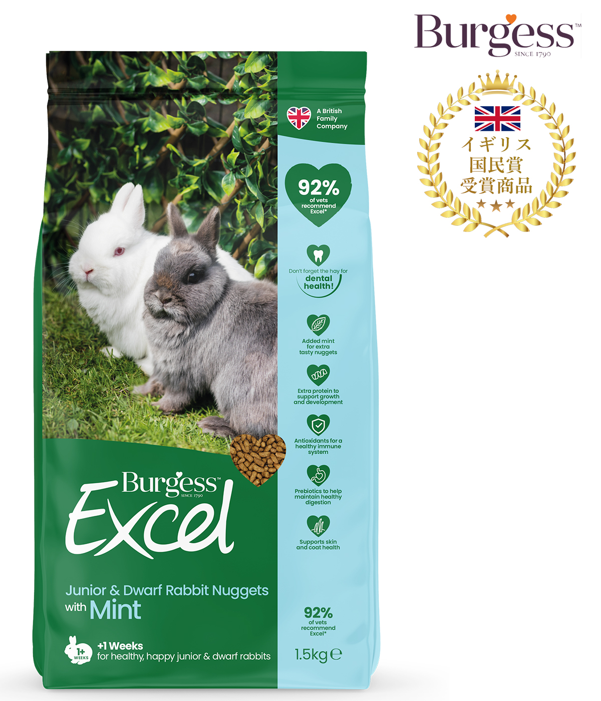 まず、いつでも新鮮で品質のよい牧草を食べられる状態にする事は必要不可欠です。その上で高品質なペレットやご褒美のための自然派おやつ(スナック)を併用し、適量与えましょう。バージェスのExcelシリーズは、うさぎの健康を第一に考えた原材料や栄養のみを厳選使用して作られています。