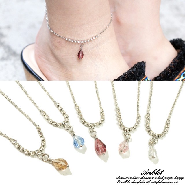 アンクレット レディースアクセサリー カラフル クリアビーズ 涙型 ティアドロップ アズキチェーン キラキラ 夏 1粒
