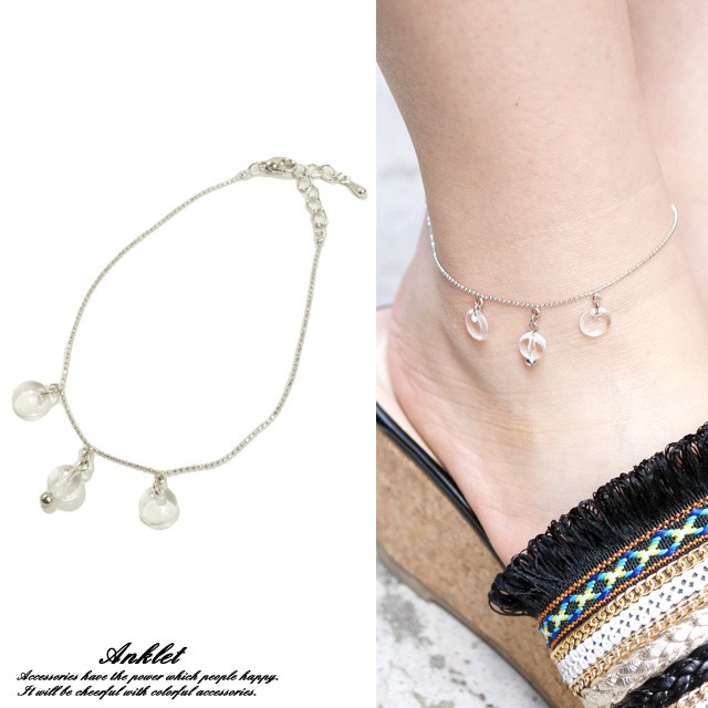 アンクレット レディースアクセサリー 3連 クリアビーズ ボールチェーン キラキラ 夏 ラウンド 丸 まる 3個
