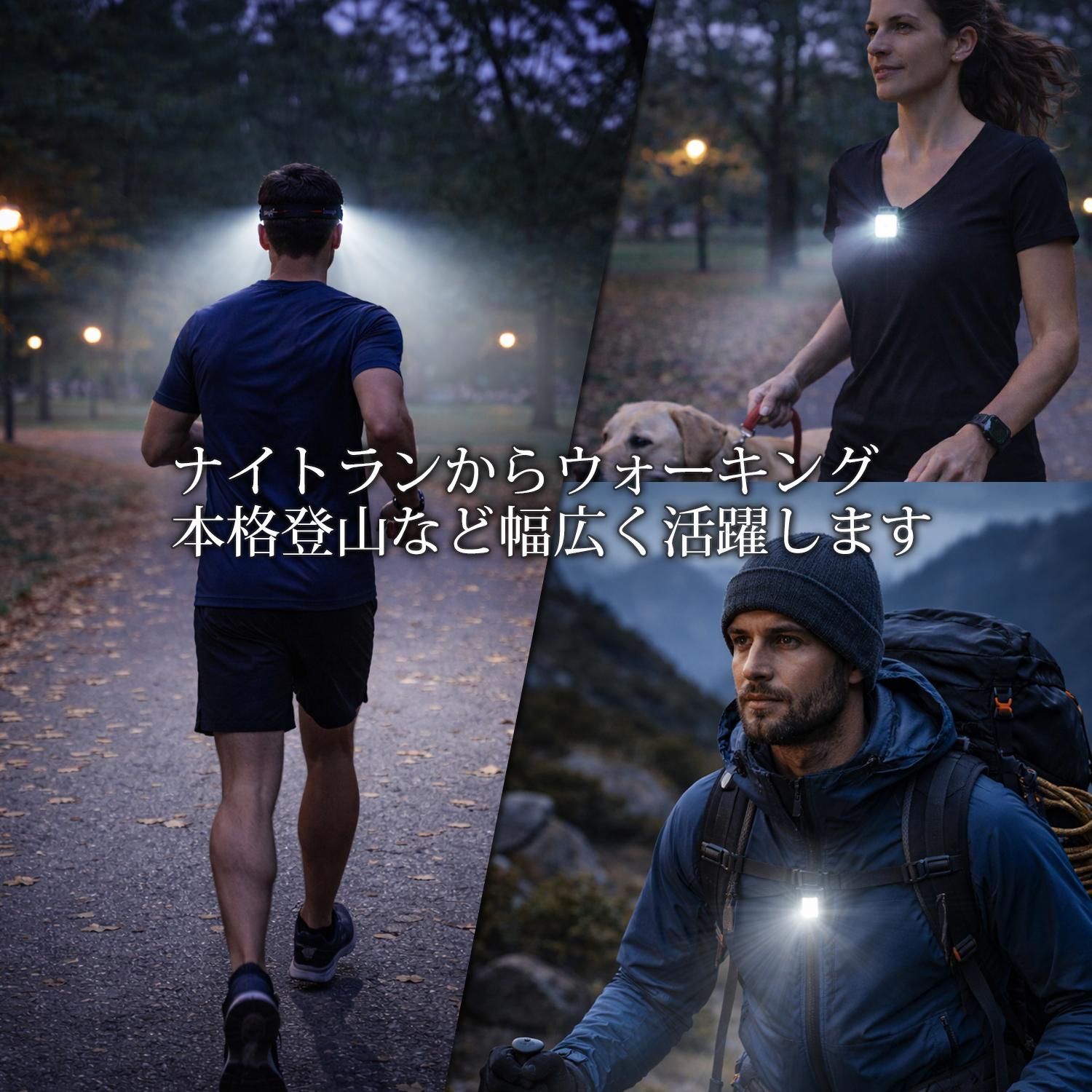 クリップ式デザインにより、衣類・バッグ・ベルト・ギアなどに安定して装着可能。運動中もズレにくく安心です。またヘッドバンドが付属しており頭につけるなど様々な場面で活躍します。