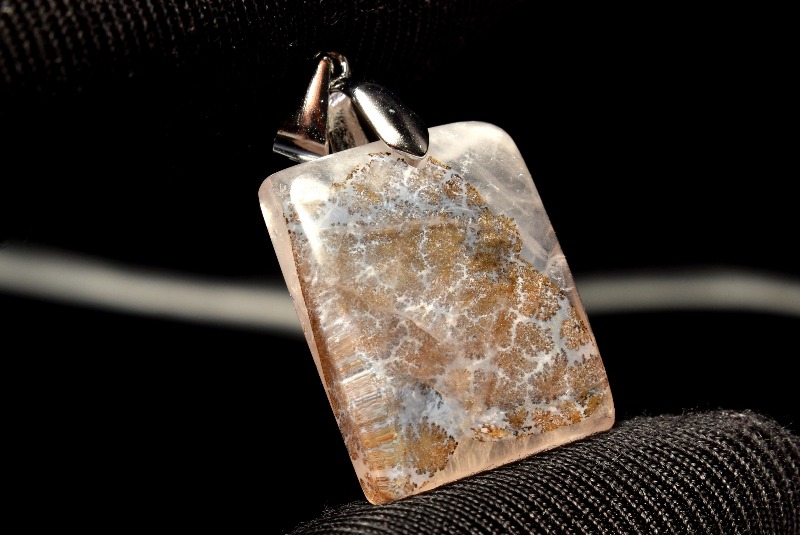 和名を忍石、模樹石といい、一見植物にも見える内包物は、水に溶け込んだ金属イオンが水晶やアゲートなどの割れ目に侵入し、微細な粒となって壁面に沈殿したものです。