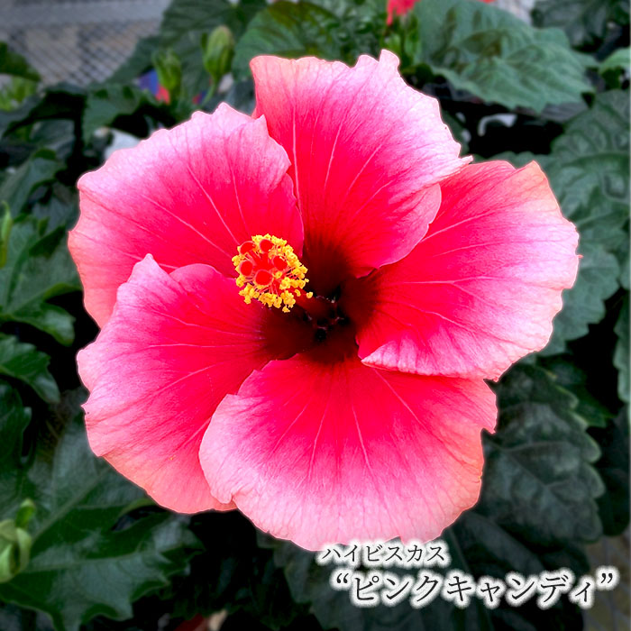 | 品種名:ピンクキャンディ 大きさ:小輪・約10cm前後 ハイビスカスは、赤・黄・白・ピンク・オレンジ色など原色の鮮やかな花色が魅力の熱帯花木です。 花の寿命はほとんど1日限りですが、大輪の品種や涼しい季節は2日もつことがあります。 |