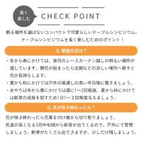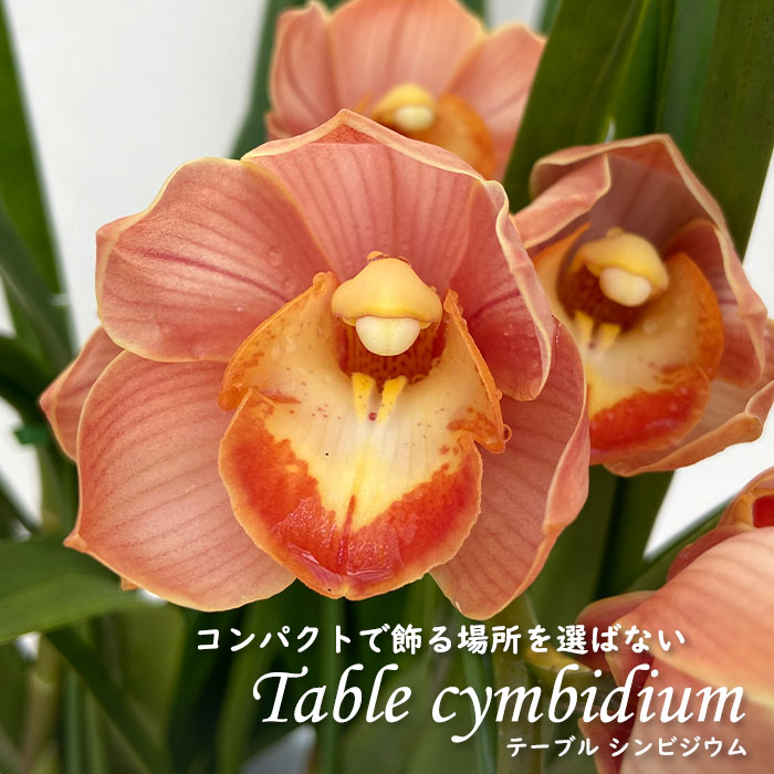 テーブルシンビジウムは”冬の代表花”のイメージがありますが、真冬に開花をしているテーブルシンビジウムは、夏の間”山あげ”という涼しい場所にて管理をしているため、開花時期を調整しています。 通常の管理では、冬〜春咲きとなります。 | ■ 置き場所 | 12月〜4月は室内のレースのカーテン越しで明るい場所にて管理してください。 5月〜10月は戸外の風通しの良い半日陰で管理してください。 真夏は直射日光は葉焼けの原因になるので注意してください。 | ■ 水やり | 冬は土が乾いたらたっぷりと水を与えてください。(週に1〜2回程度が目安となります。) 春になって新芽が出始めたら徐々に水やりの回数を増やしてください。 夏は1日1回〜2回程度が目安となります。 | ■ 肥料 | 開花中の肥料は不要です。 春から秋にかけて月に一回程度の液肥を与えます。 | ■ サイズ・その他 | 4号鉢