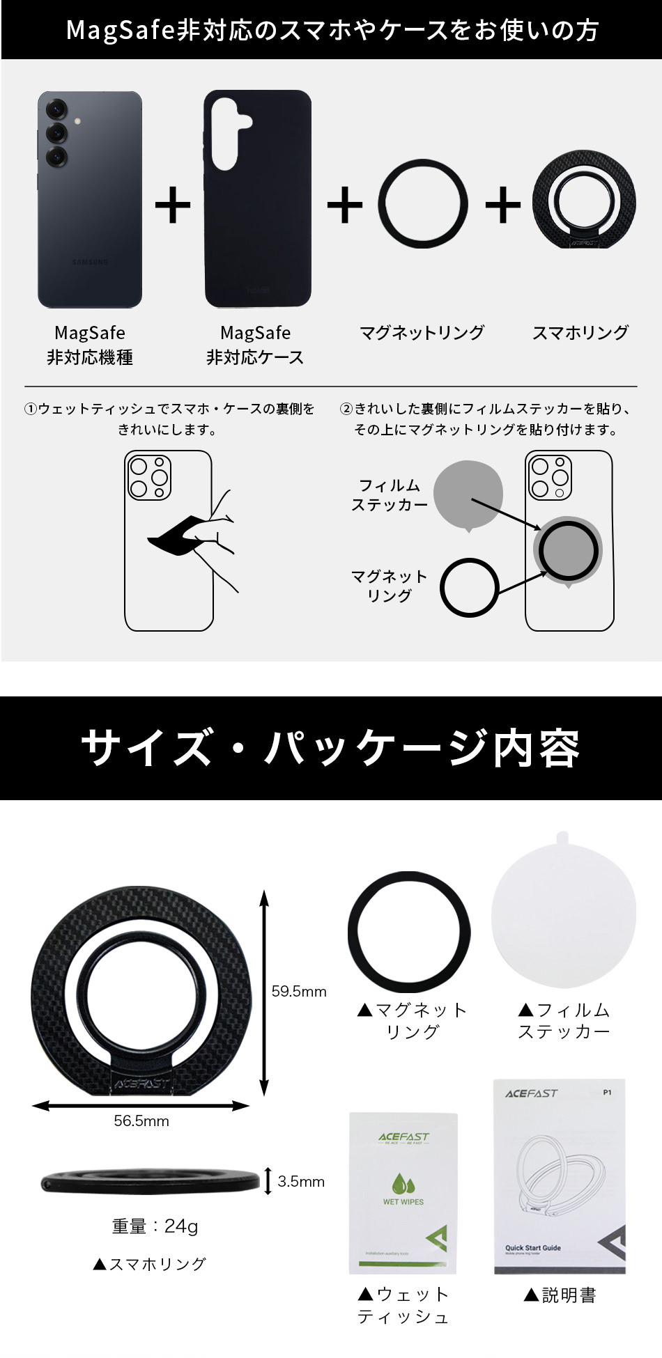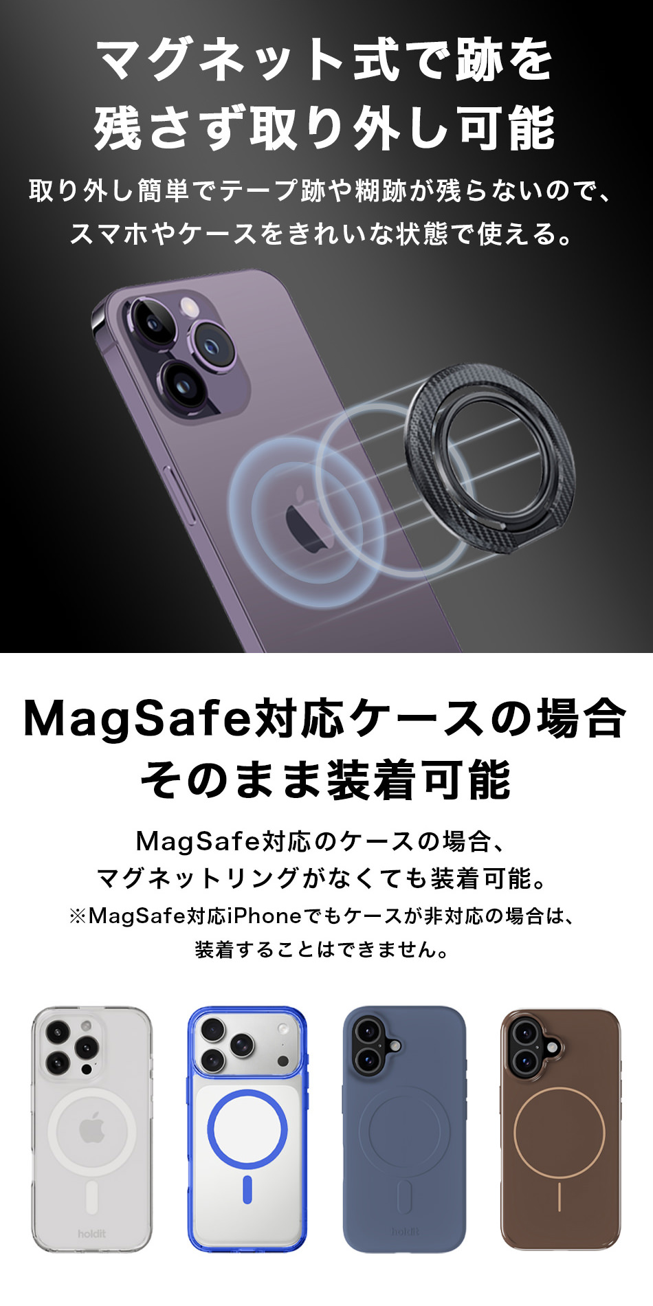 MagSafe対応ケースの場合、マグネットリングがなくても装着可能。※MagSafe対応iPhoneでもケースが非対応の場合は、そのまま装着することはできません。