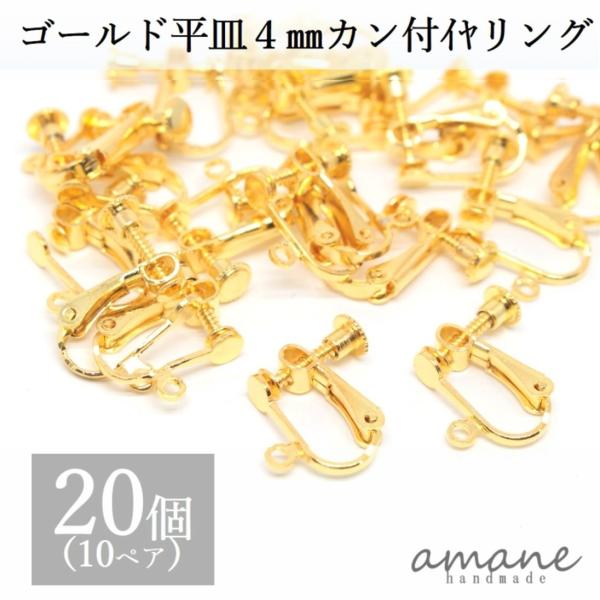 イヤリング金具 ネジバネ式 丸皿 4mm カン付 20個 ゴールド