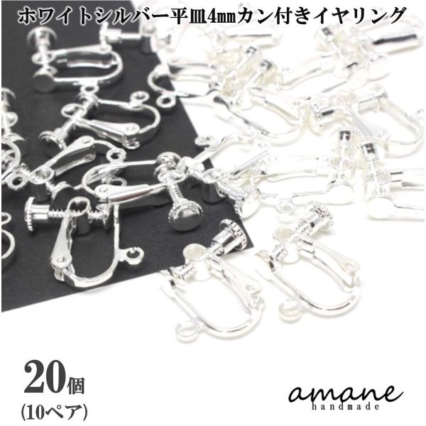 イヤリング金具 ネジバネ式 丸皿 4mm カン付 20個 ホワイトシルバー アクセサリーパーツ