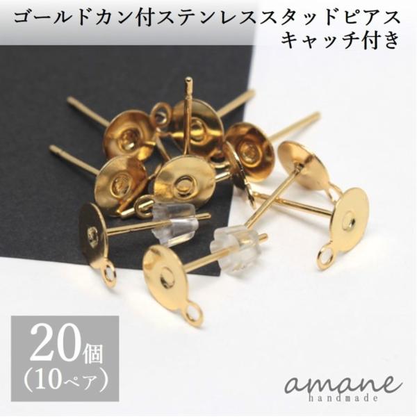 ポストピアス キャッチ付 ゴールド パーツ ステンレス 平皿 丸カン 付き 20個 ハンドメイド ピアス用金具