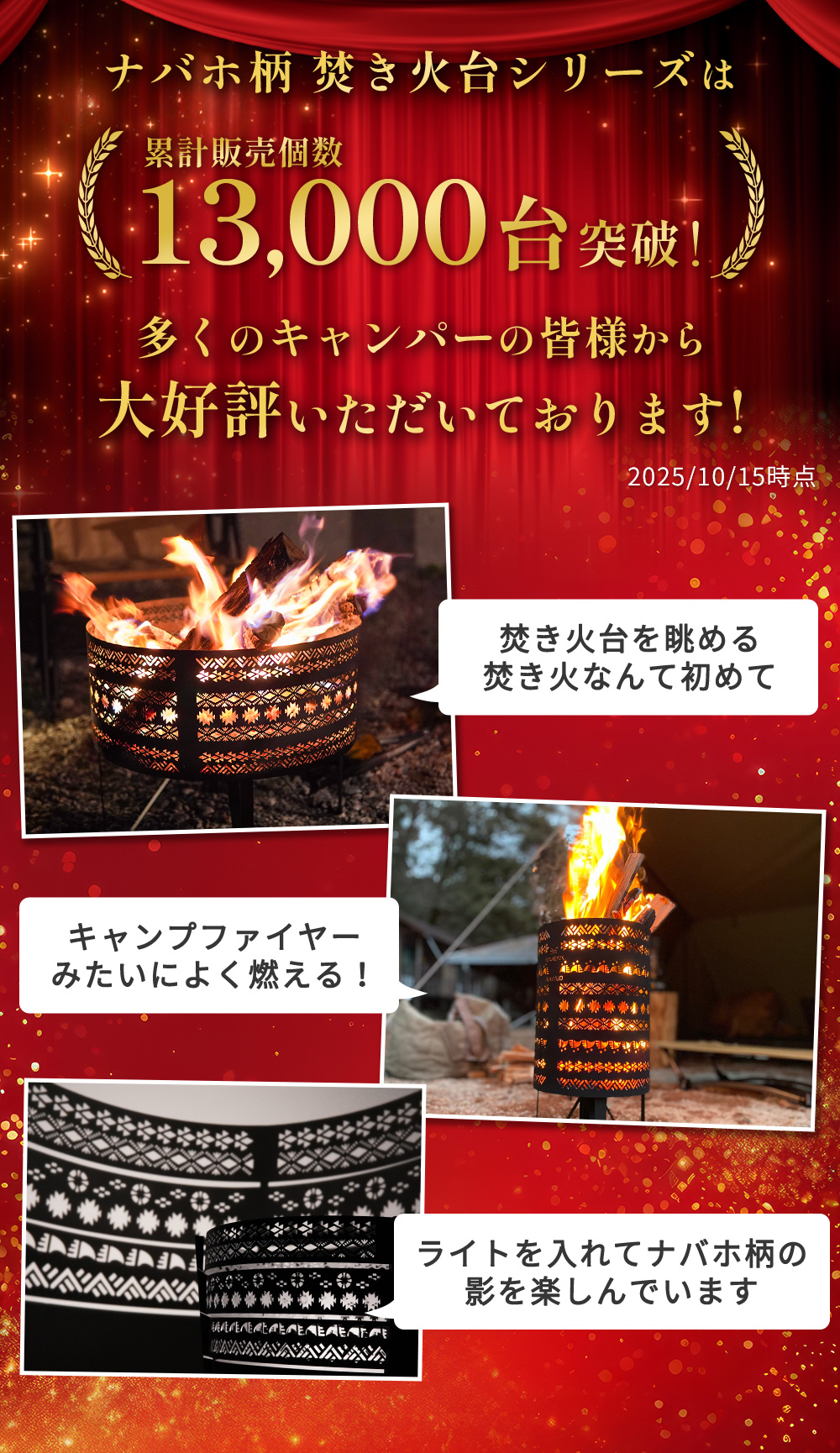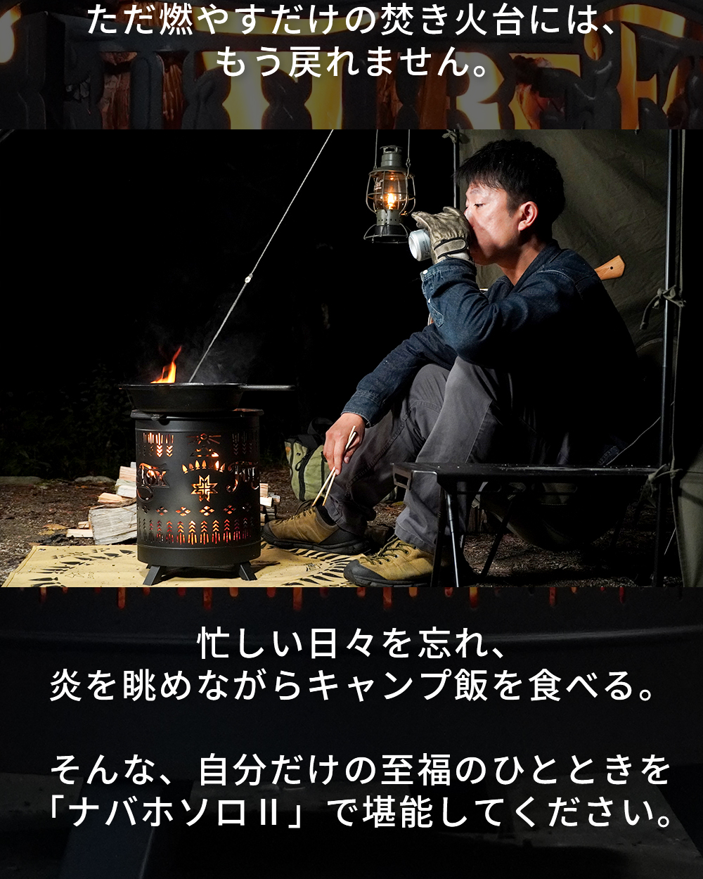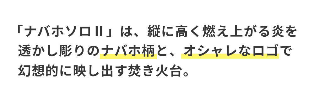 ナバホソロ2は、炎の美しさとナバホ柄を楽しむ縦型のソロ用焚き火台です。