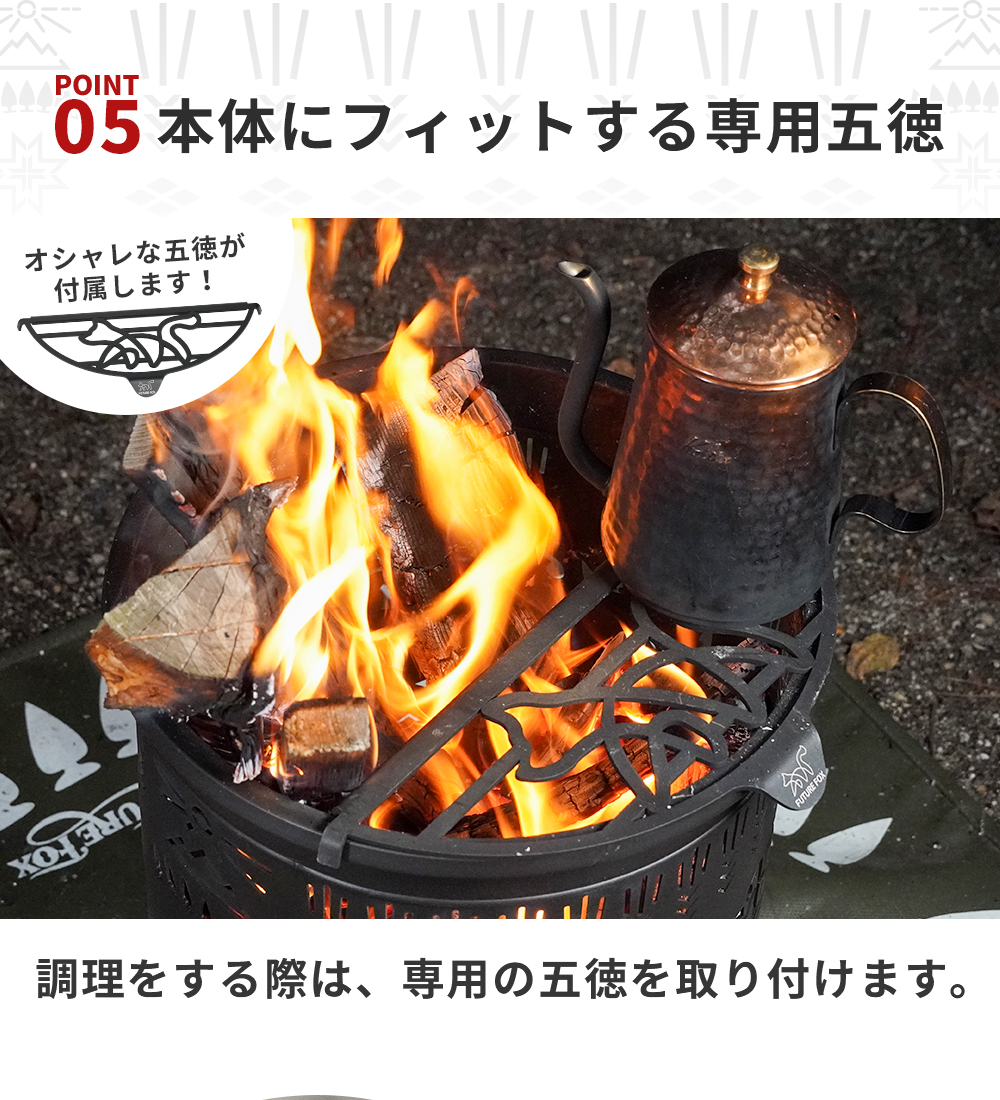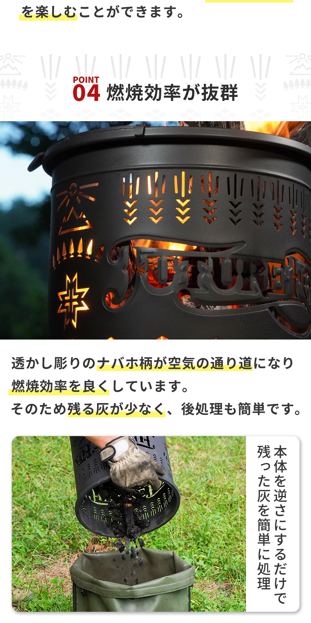 燃焼効率の高い通気構造により、薪が良く燃え、火柱が立ち上がる迫力ある焚き火が楽しめます。