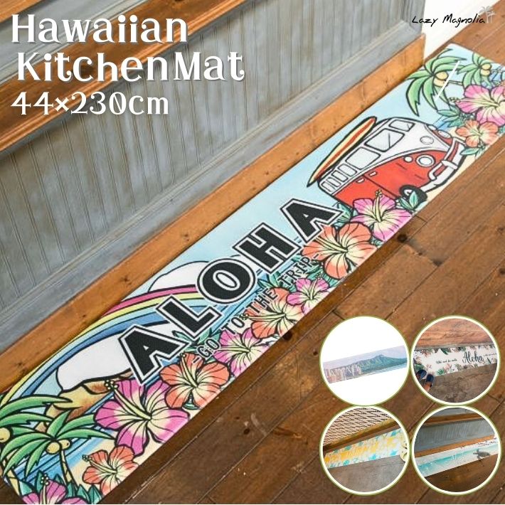 プルメリアやホヌなどのHAWAIIを代表するモチーフのキッチンマット。広いキッチンの長さにも対応した230cmサイズです。柔らかい素材で、防水、汚れてもサッと拭くだけでお手入れ簡単なマットです。